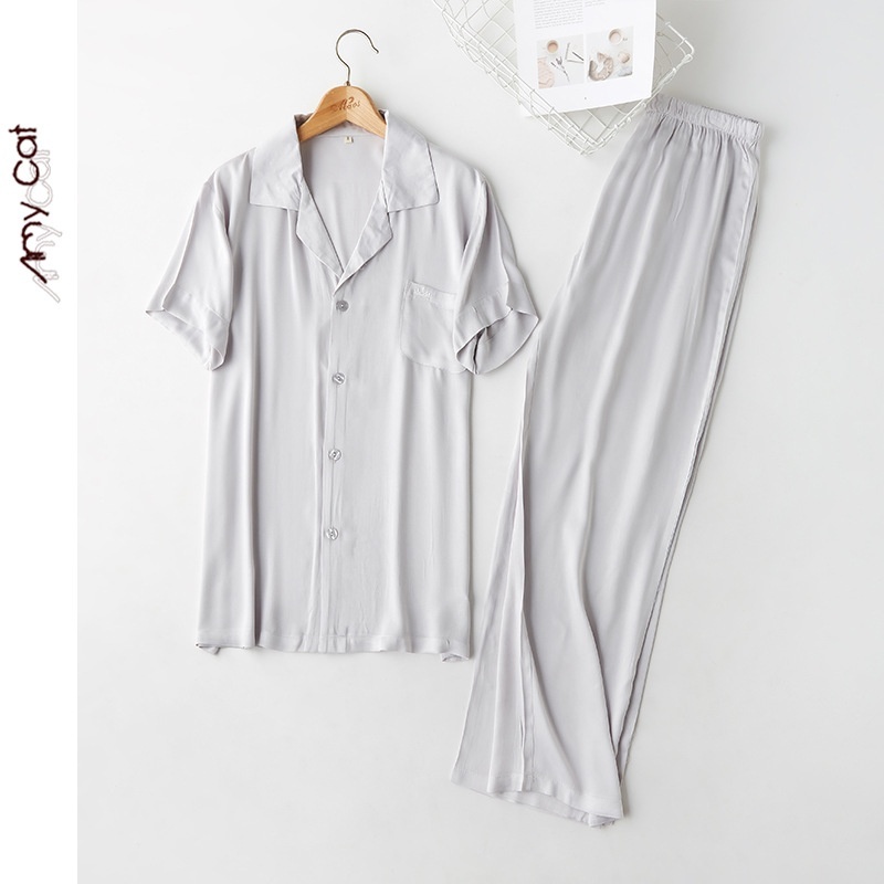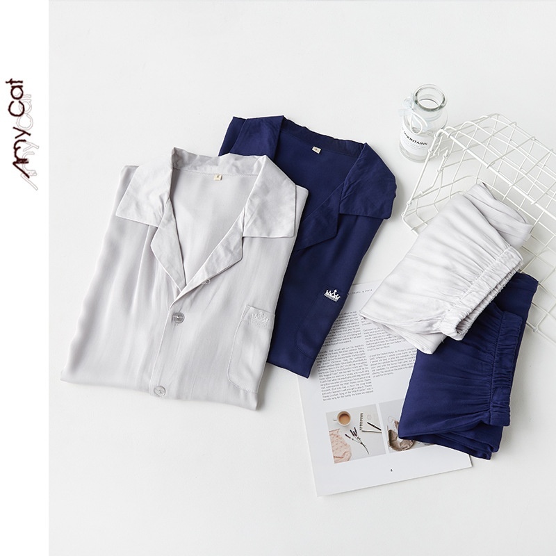 Miximao Spring And Summer Pajamas Men's Solid Color Crown Embroidery Satin Short Sleeves Long Pants Lapel Home Clothes T