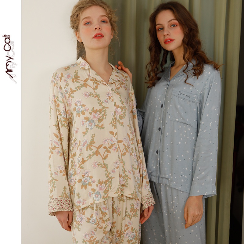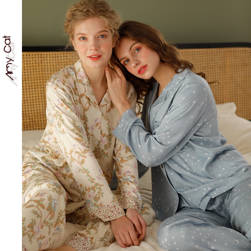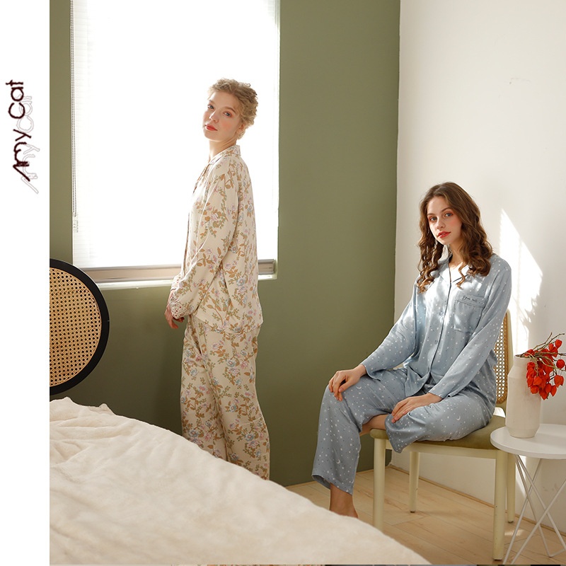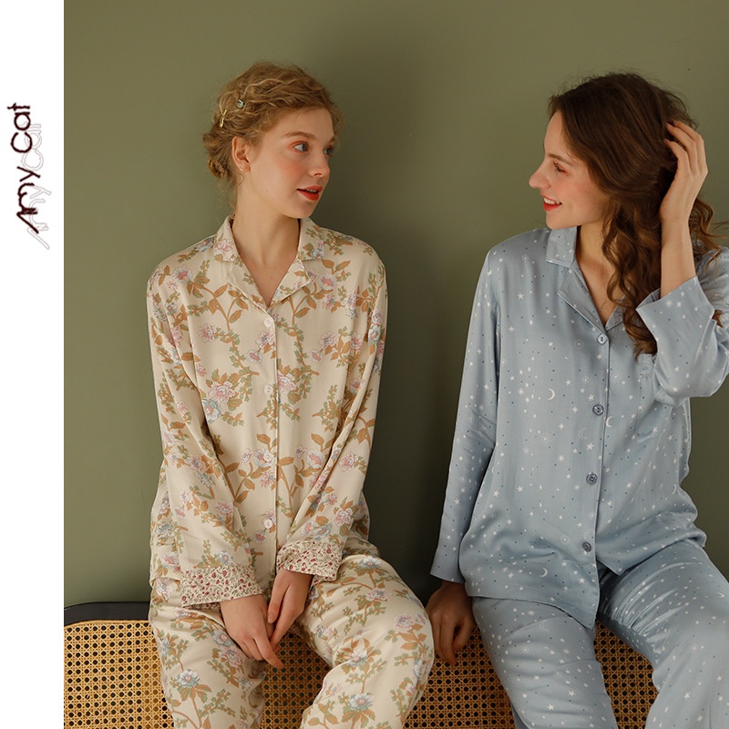 Mi Ximao Spring Elegant Natural Satin Printed Pajamas Women's Star Moon Bamboo Set T