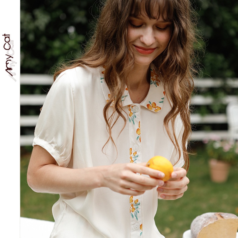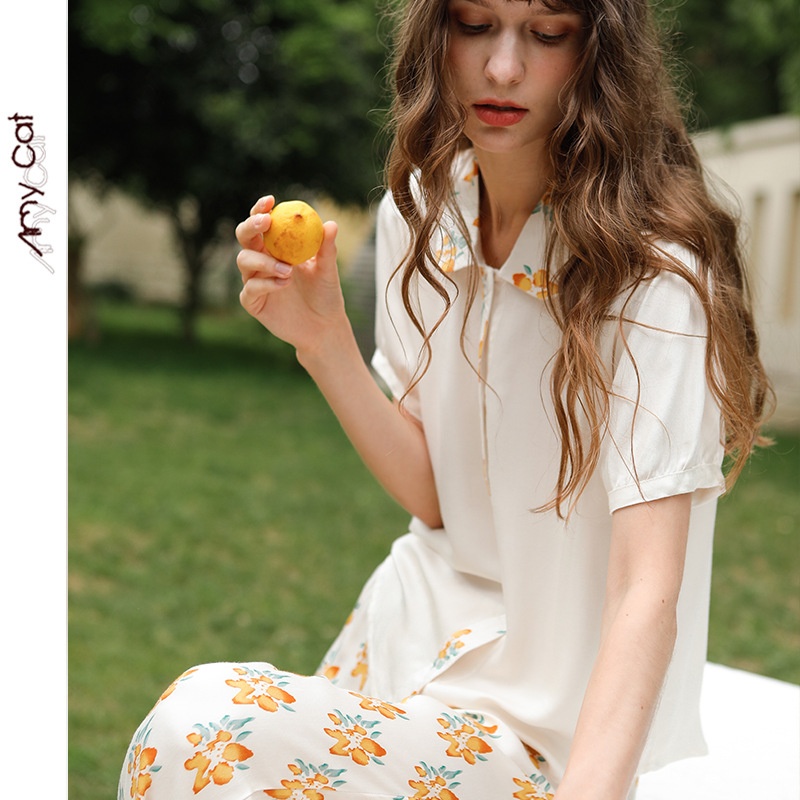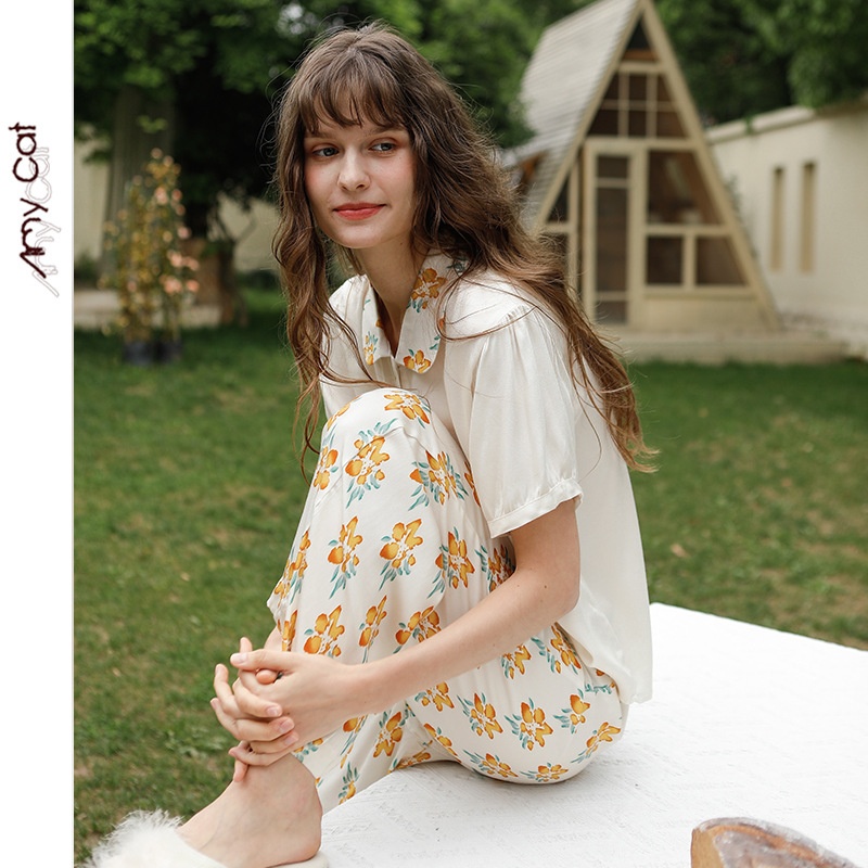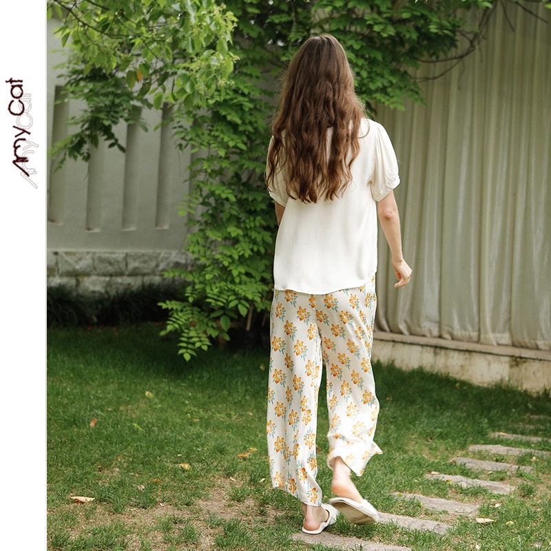 Mixi Cat Fairy Sweet Satin Women's Pajamas Sunshine Small Yellow Stamen Chrysanthemum Short Sleeve Pants6578 T