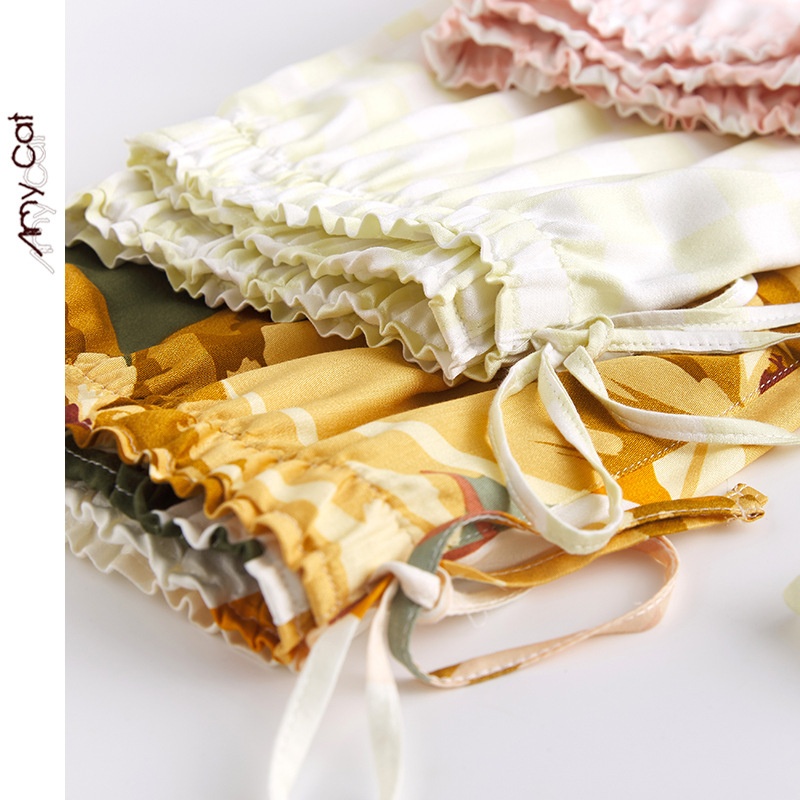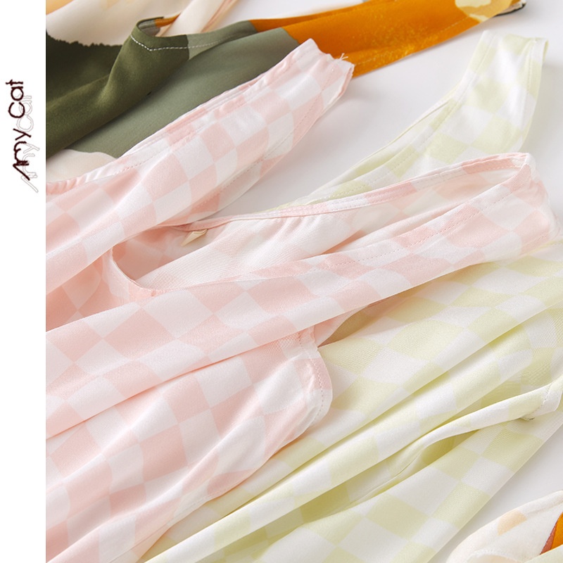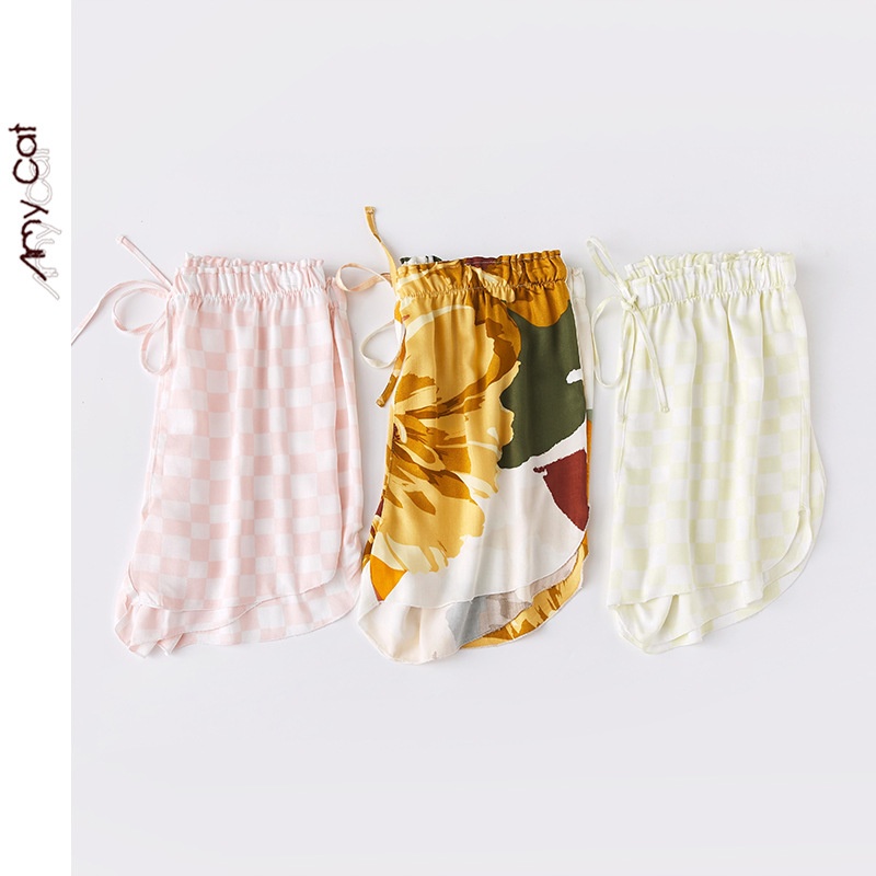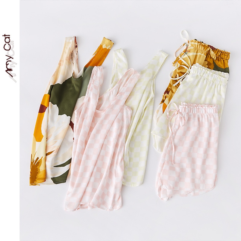 Miximao Summer Casual Pajamas Sleeveless Satin Printed Vest Shorts Home Suit T