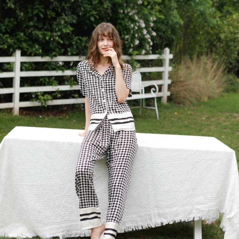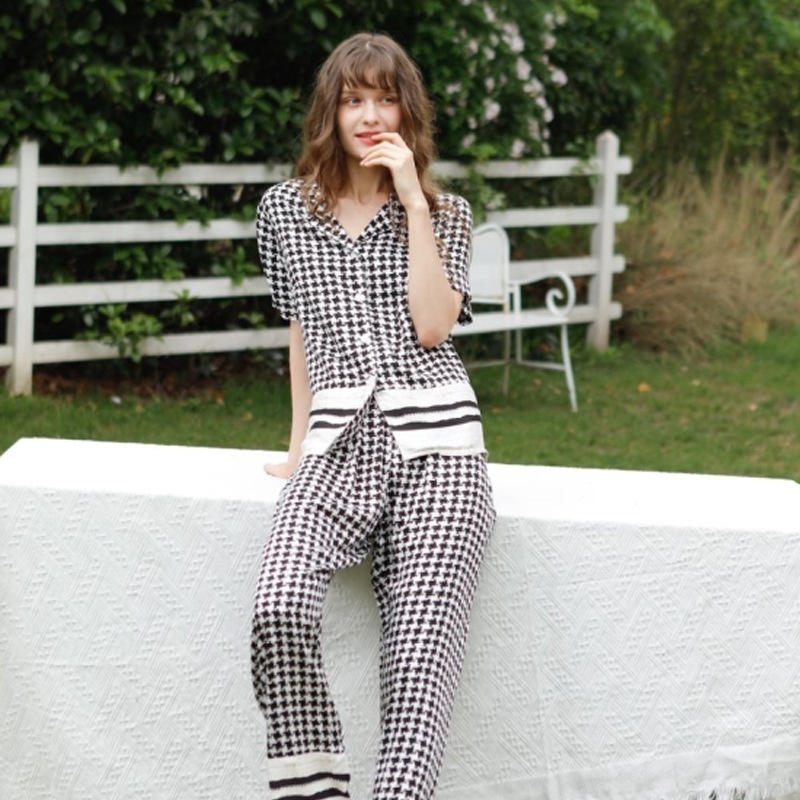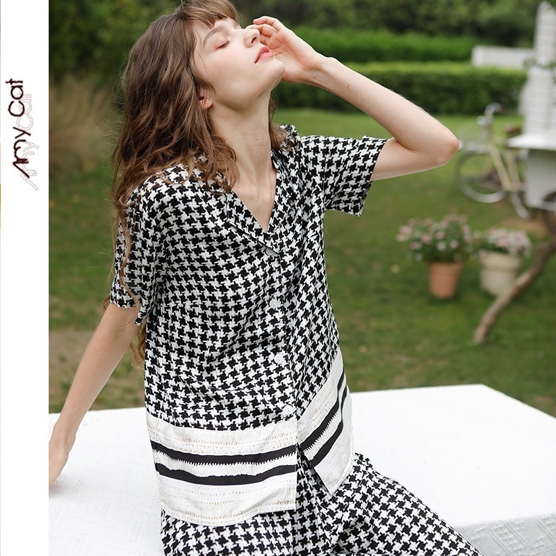 Mixi Cat Pajamas Women's Spring And Summer Products Tribute Satin Thin Korean Version Of Houndstooth Short-sleeved Trousers Home Clothes7 T