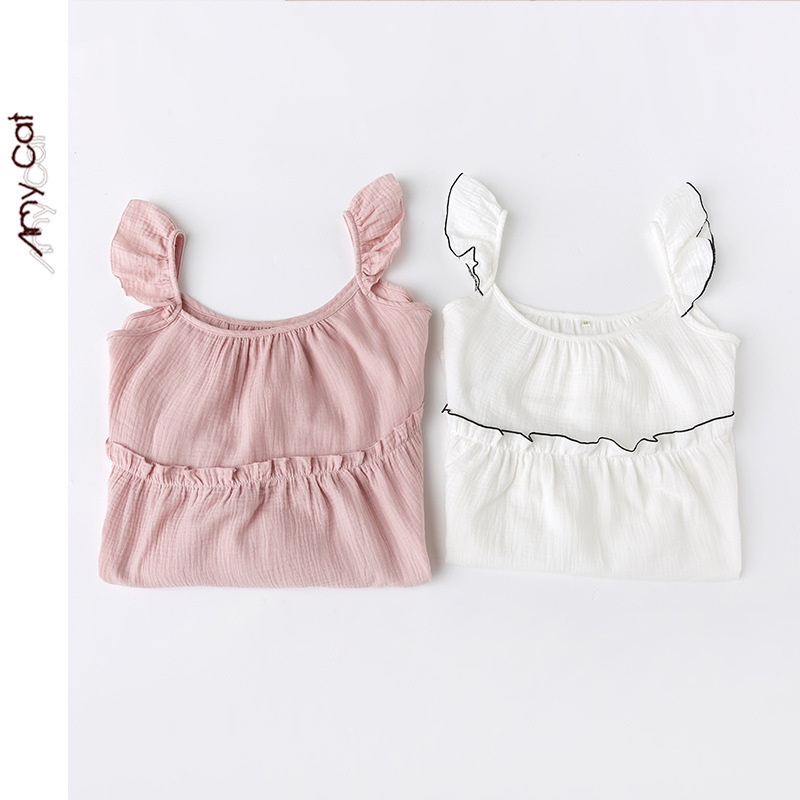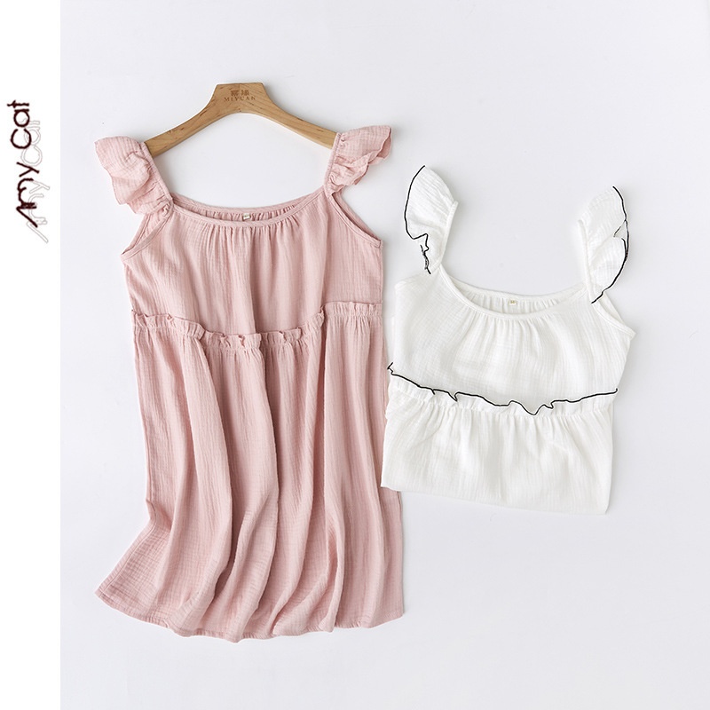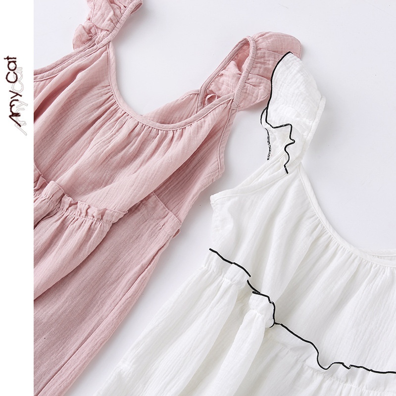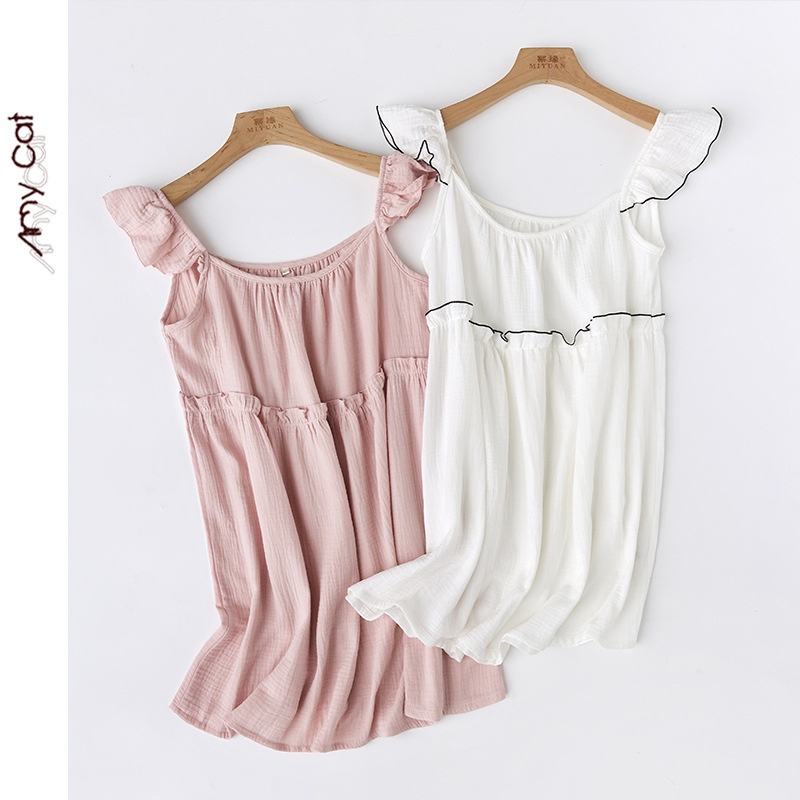 Miximao Pure Cotton Crepe Solid Color Small Fresh Flying Sleeve Suspender Skirt Two-color Home Nightdress Girly S
