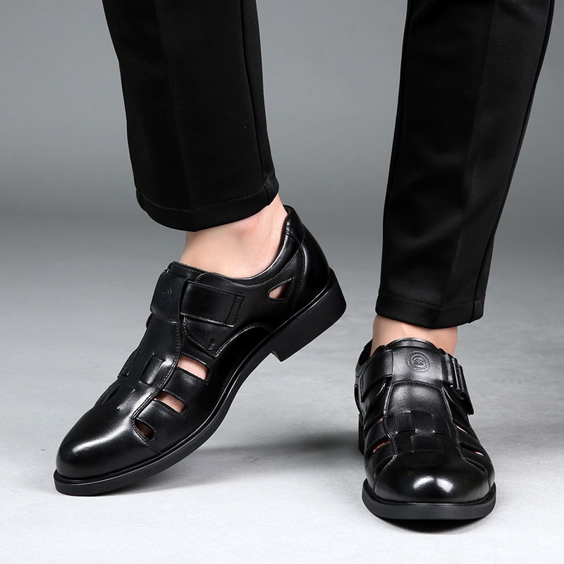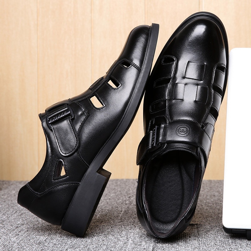 Men's Leather Shoes Summer Breathable Hollow Sandals Genuine Leather Men's Business Casual Hole Shoes Velcro Middle-aged Dad Shoes