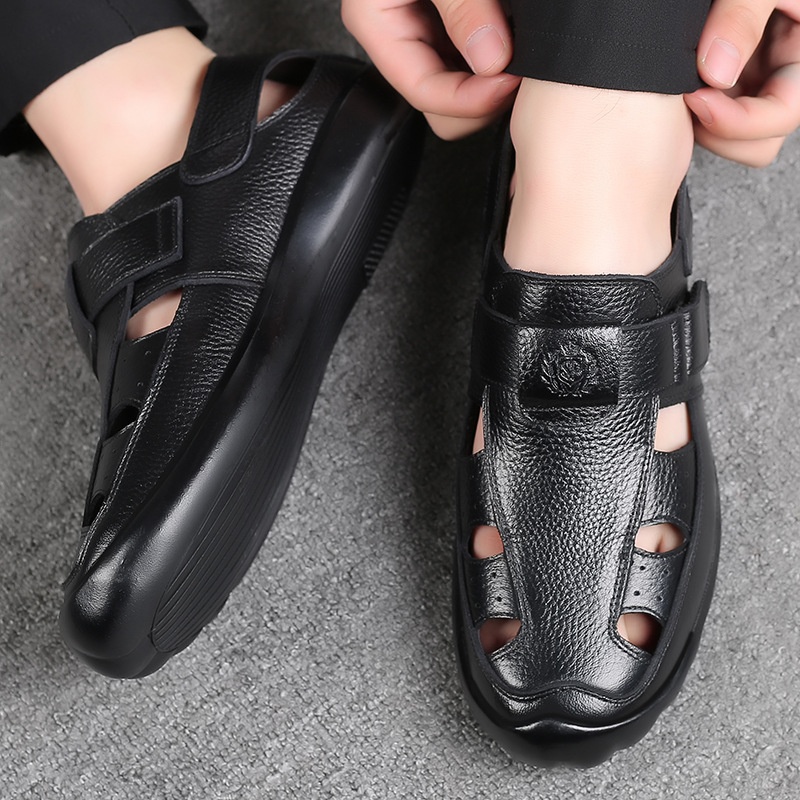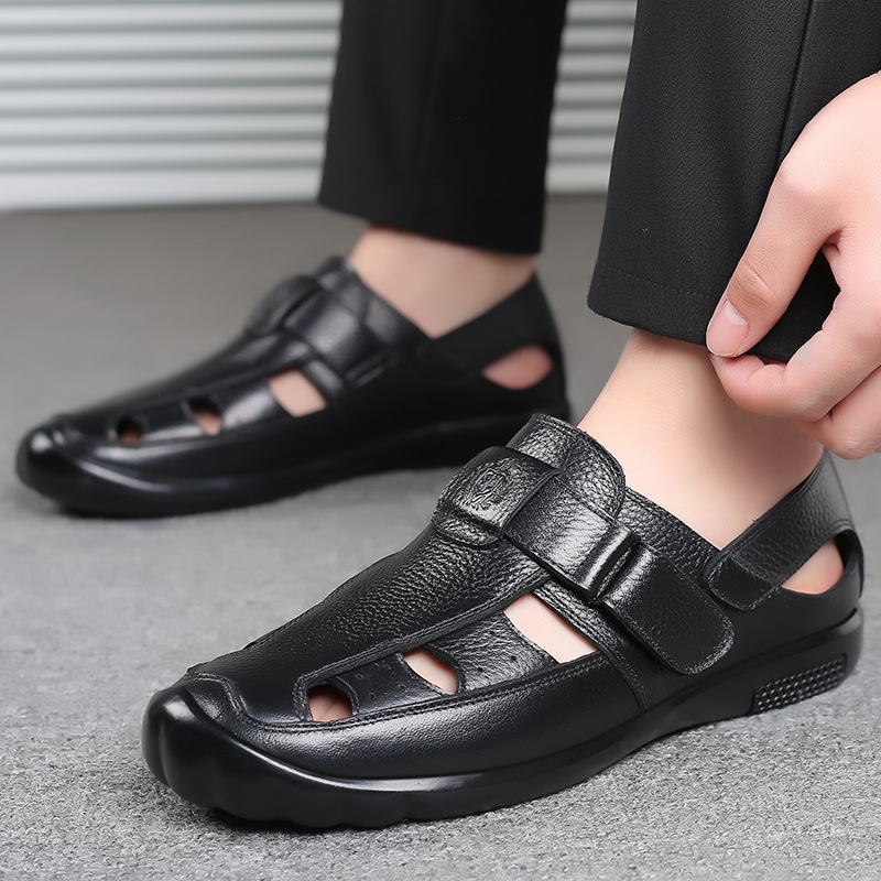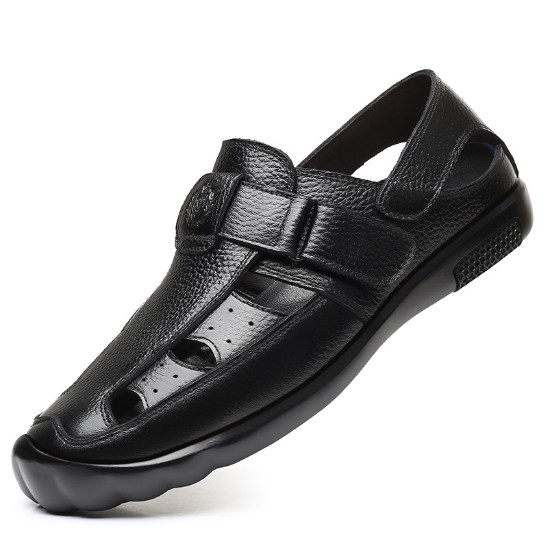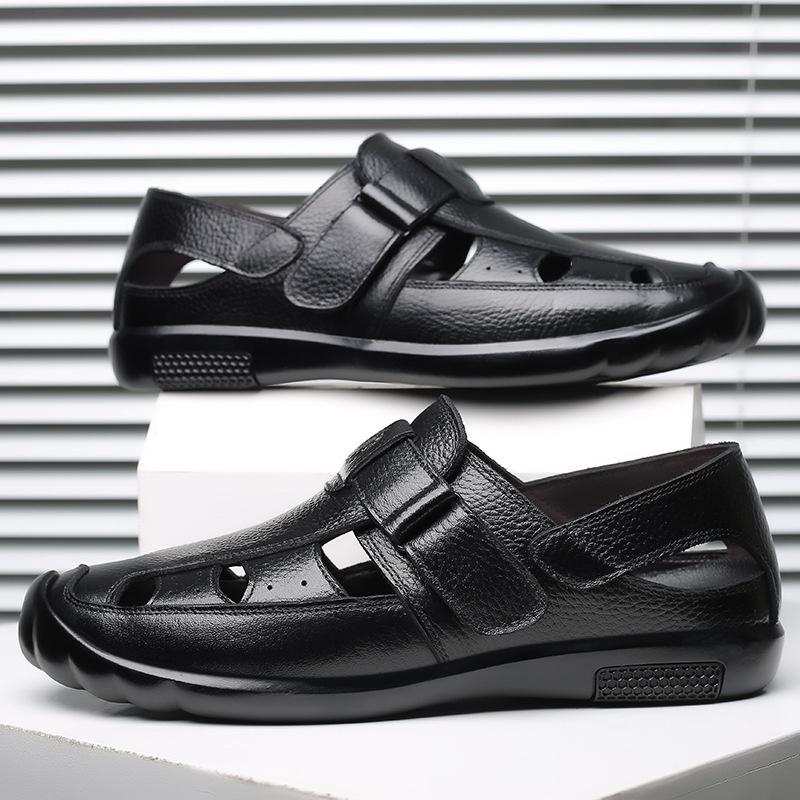 Summer Men's Sandals Genuine Leather Hollow Breathable Men's Shoes Casual Leather Hole Shoes Soft Sole Middle-aged Dad Shoes