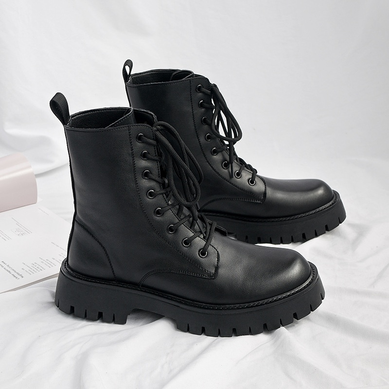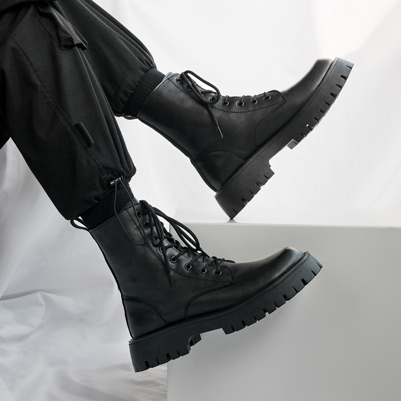 British Style Genuine Leather Black Martin Boots Men's High Top Thick Bottom Heightening Korean Style Leather Bootsy Men's Autumn Workwear Motorcycle Boots