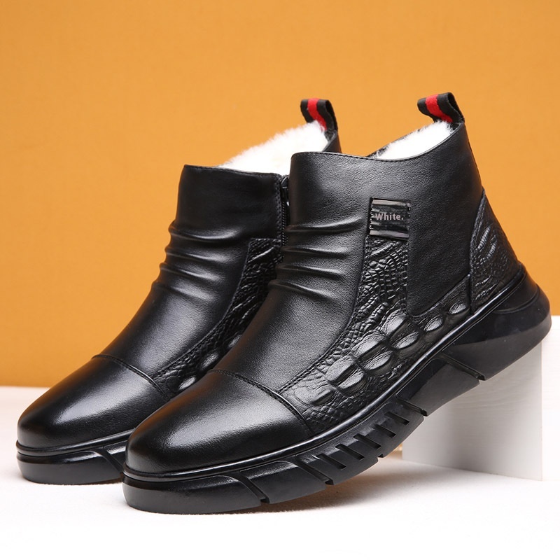 Genuine Leather Men's Shoes Winter Plus Velvet Warm High-top Leather Shoes Crocodile Pattern Quick-hand Casual Shoes Men's Net Celebrity Men's Cotton Shoes