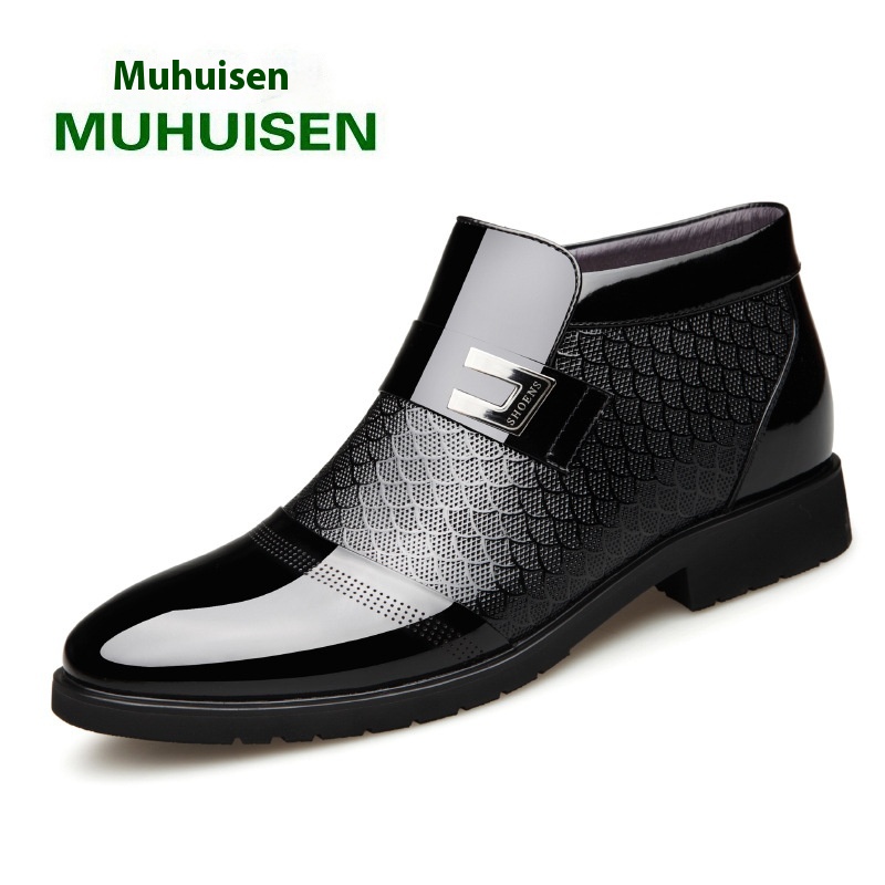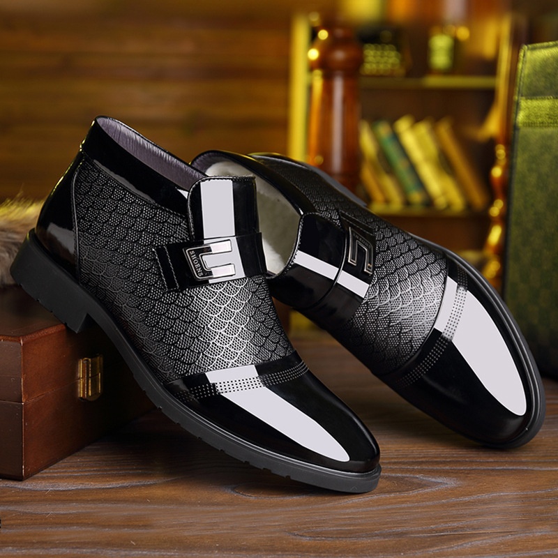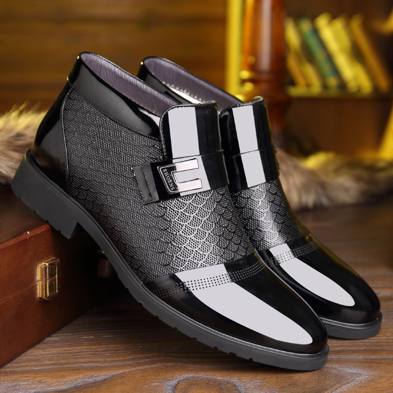 Winter Thick Warm Cotton Shoes Men's Painted Shiny Leather High Top Men's Shoes Plus Velvet Non-slip Business Formal Leather Shoes Men