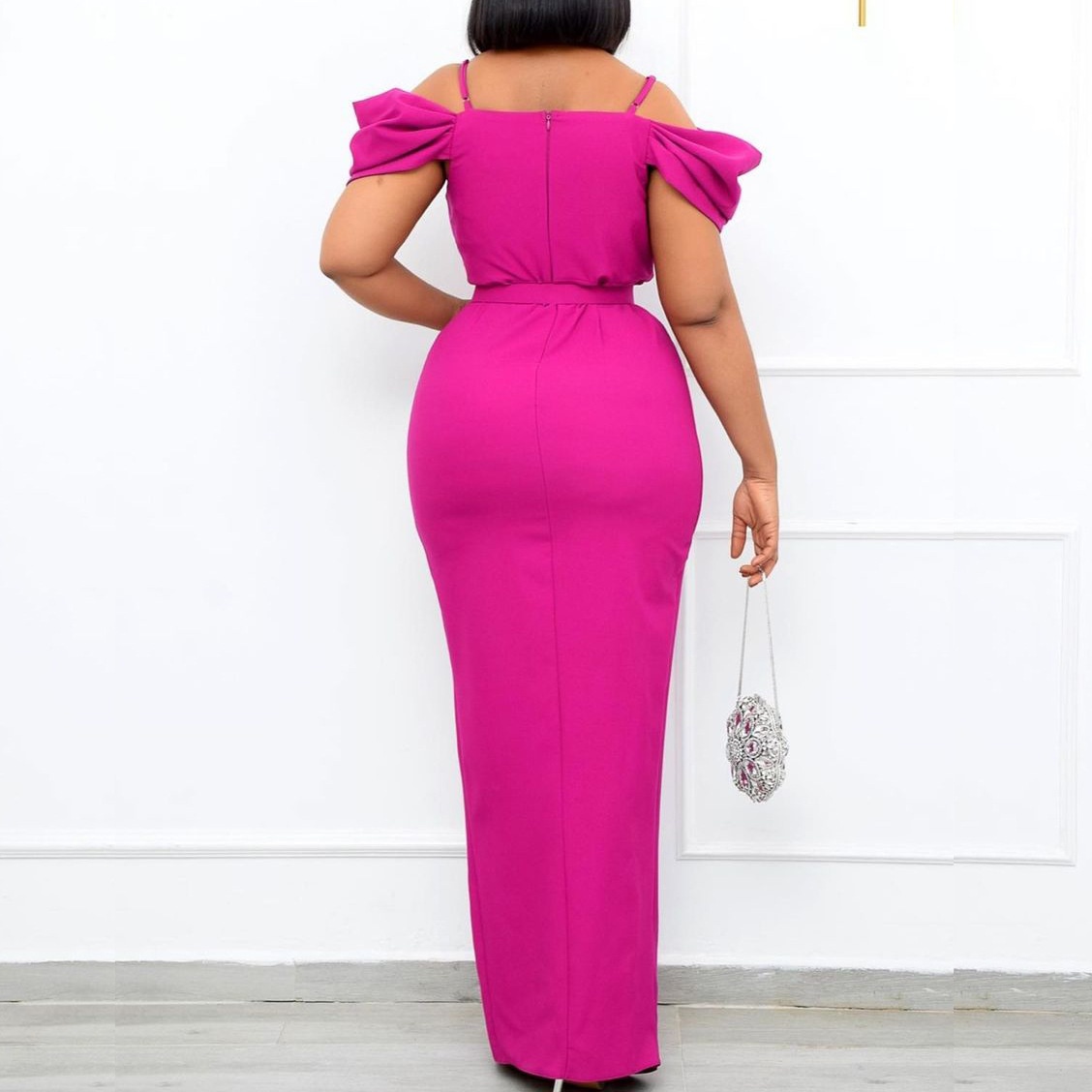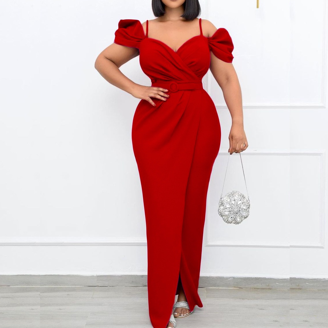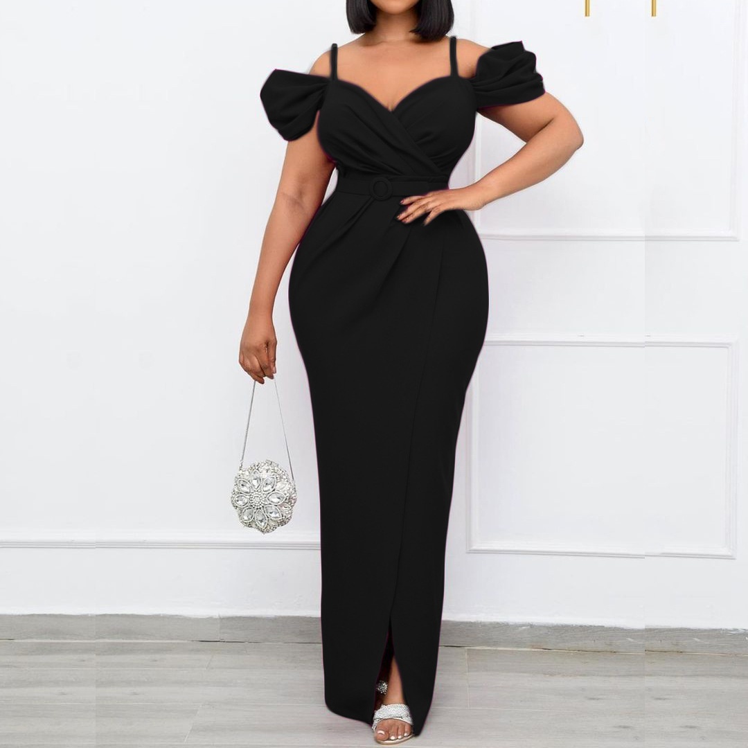 D181 Free Belt Off-shoulder Suspenders Solid Color V-neck Sexy Hip-wrapped Long Dress Dress European And American Dress