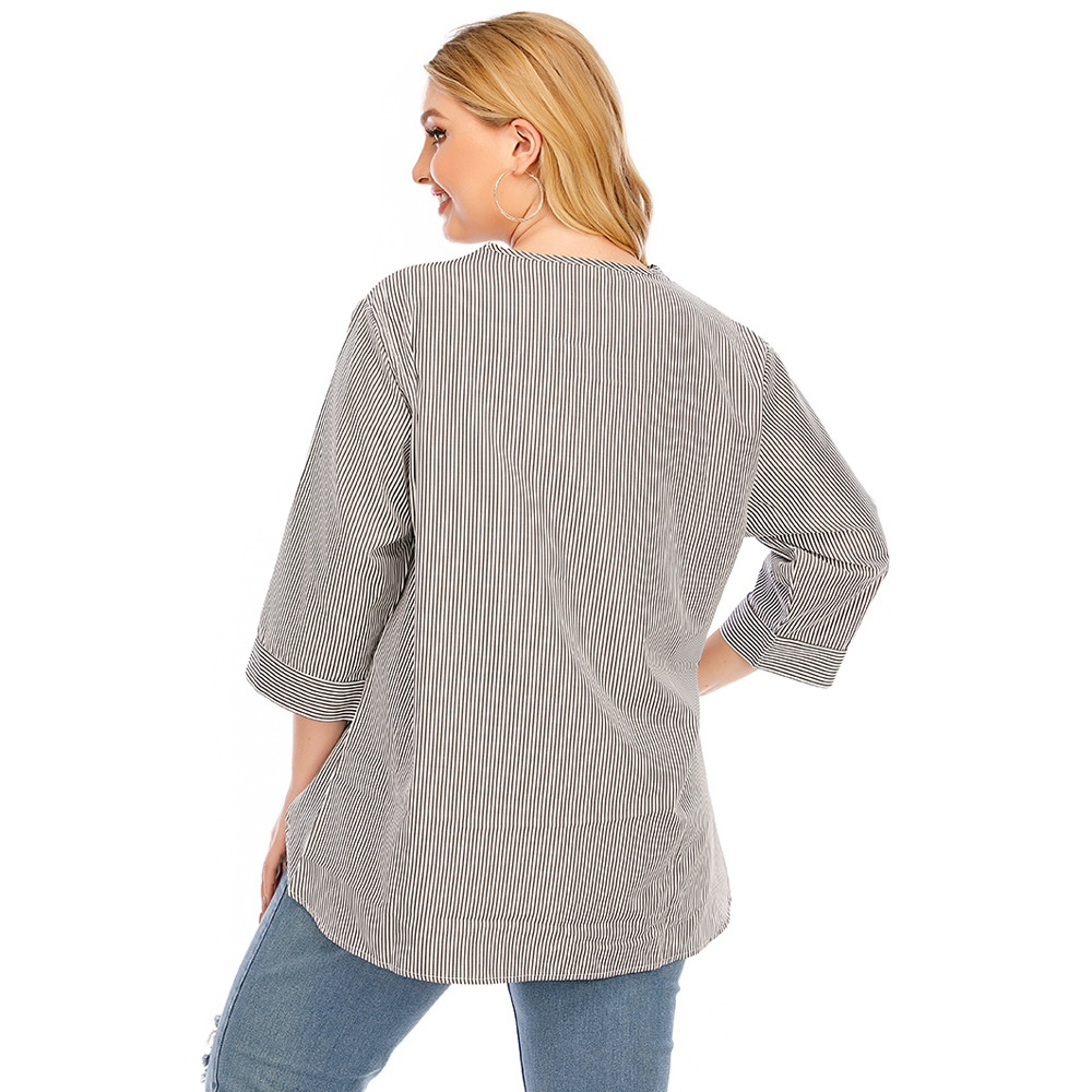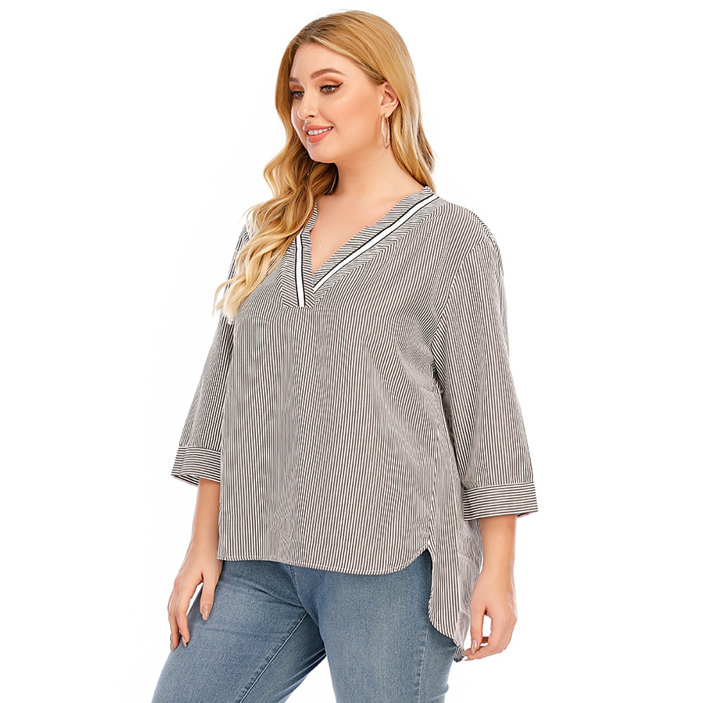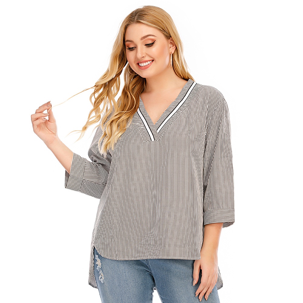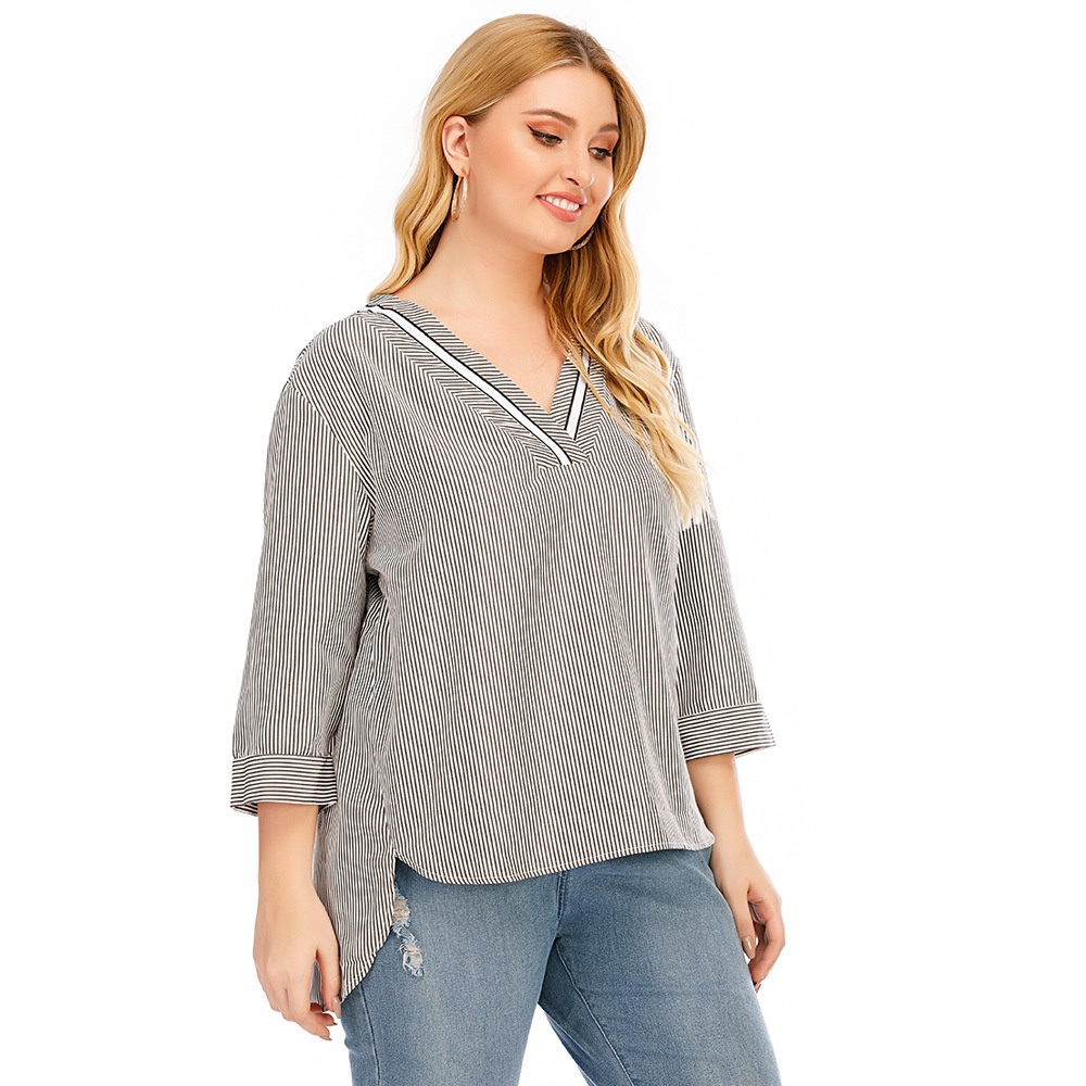 Summer European And American Women's Large Size V-neck Three-quarter Sleeve Swallowtail Striped Splicing Casual T-shirt