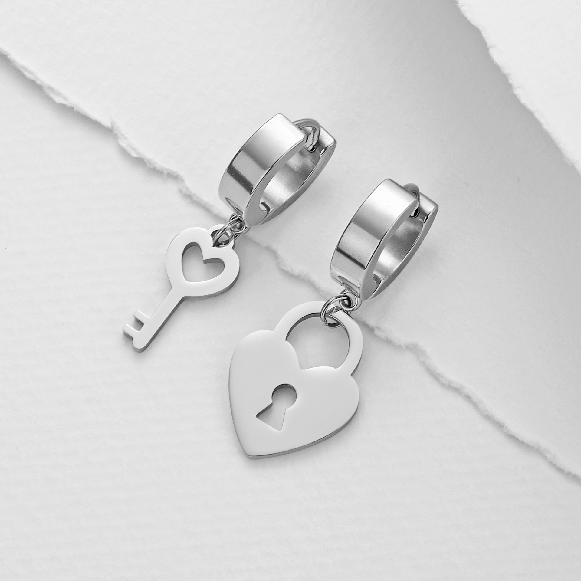 Fashion All-match Titanium Steel Cutting Heart Lock Combination Asymmetric Pendant304 Stainless Steel Earrings