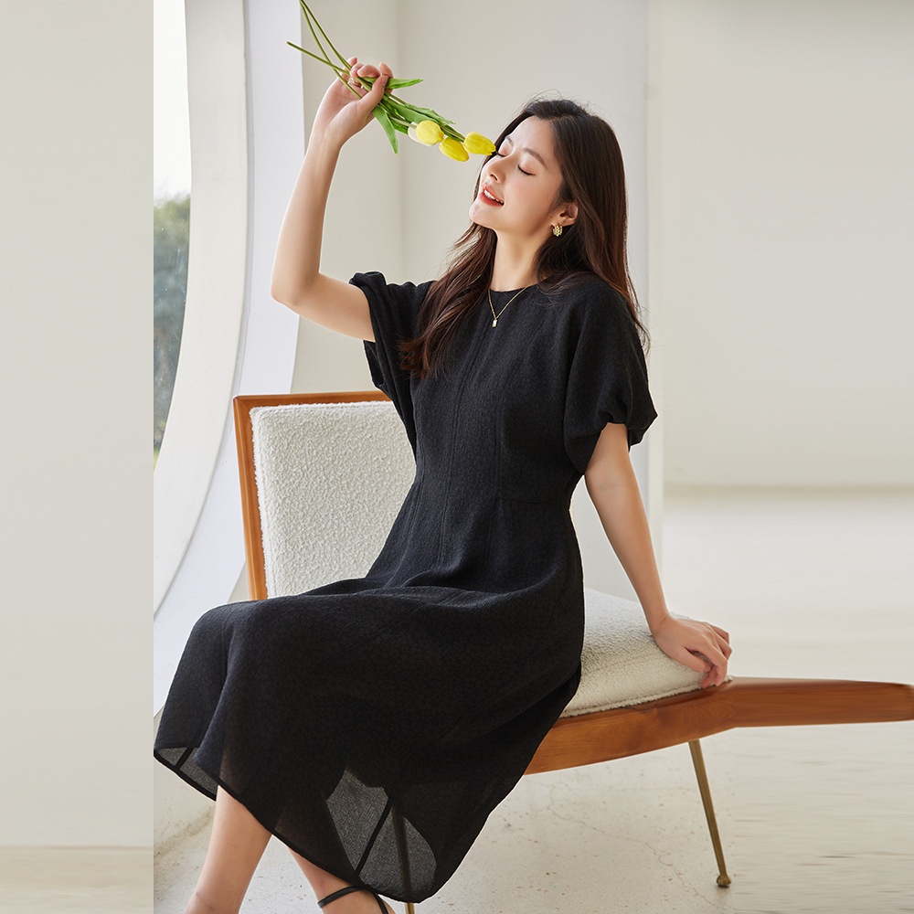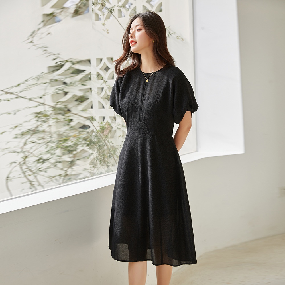 Shenghong23 Spring And Summer Elegant Temperament Lantern Sleeves Slim Texture Black Dress12097