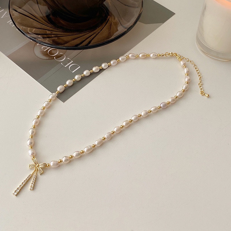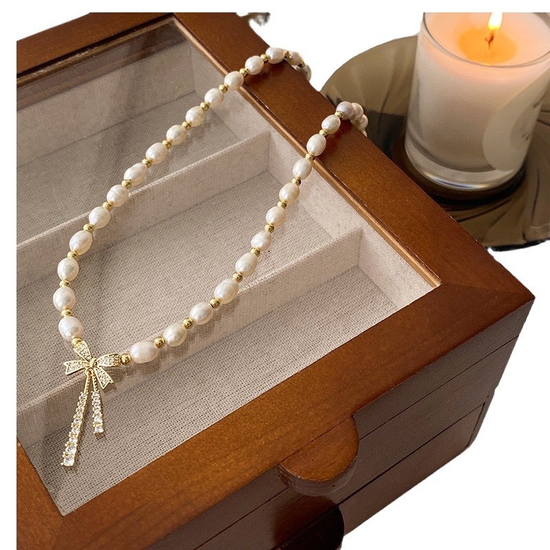 Spring And Summer French Tassel Bow Necklace Temperament High-end Natural Freshwater Pearl Clavicle Necklace Light Luxury Women