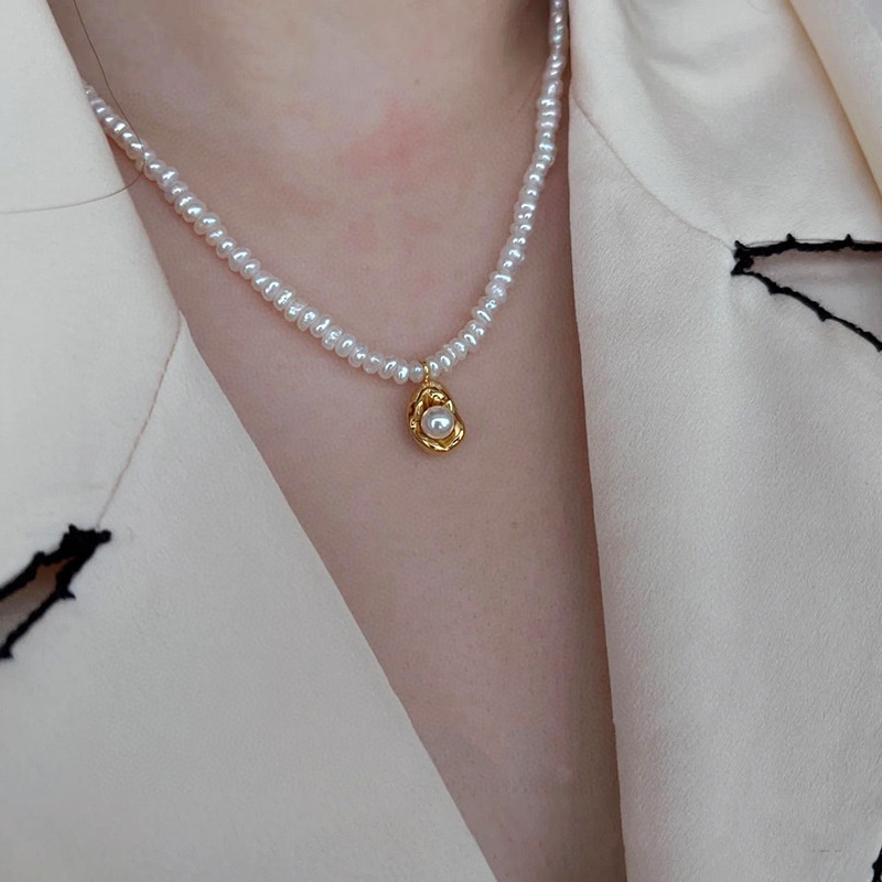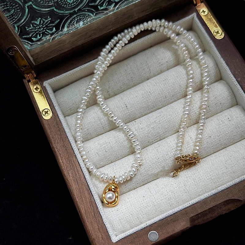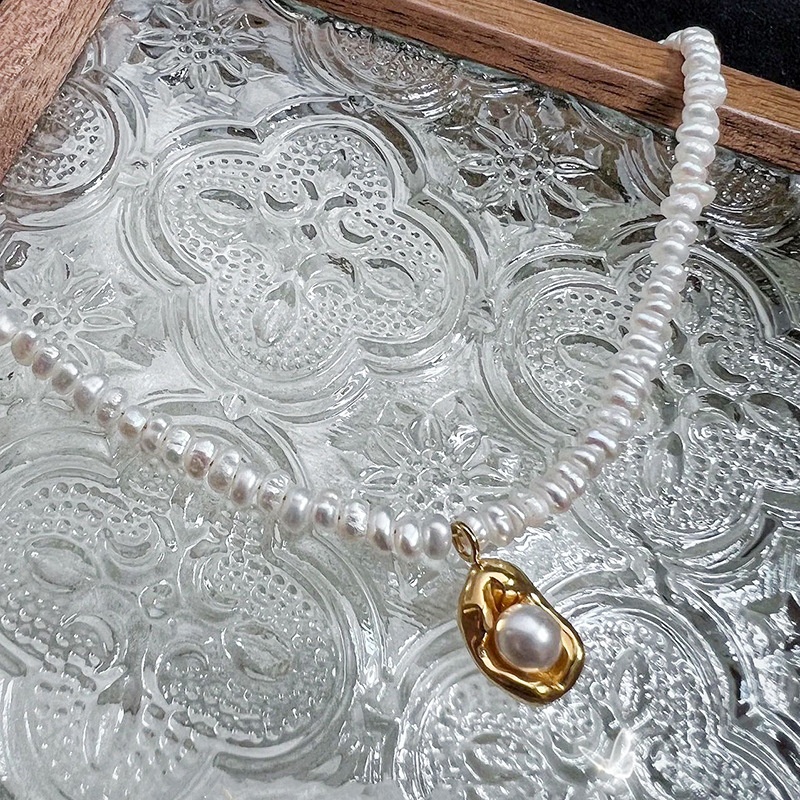 Style Irregular Baroque Freshwater Pearl Necklace Niche Fashion Retro Gold Bean Pendant Small Clavicle Chain