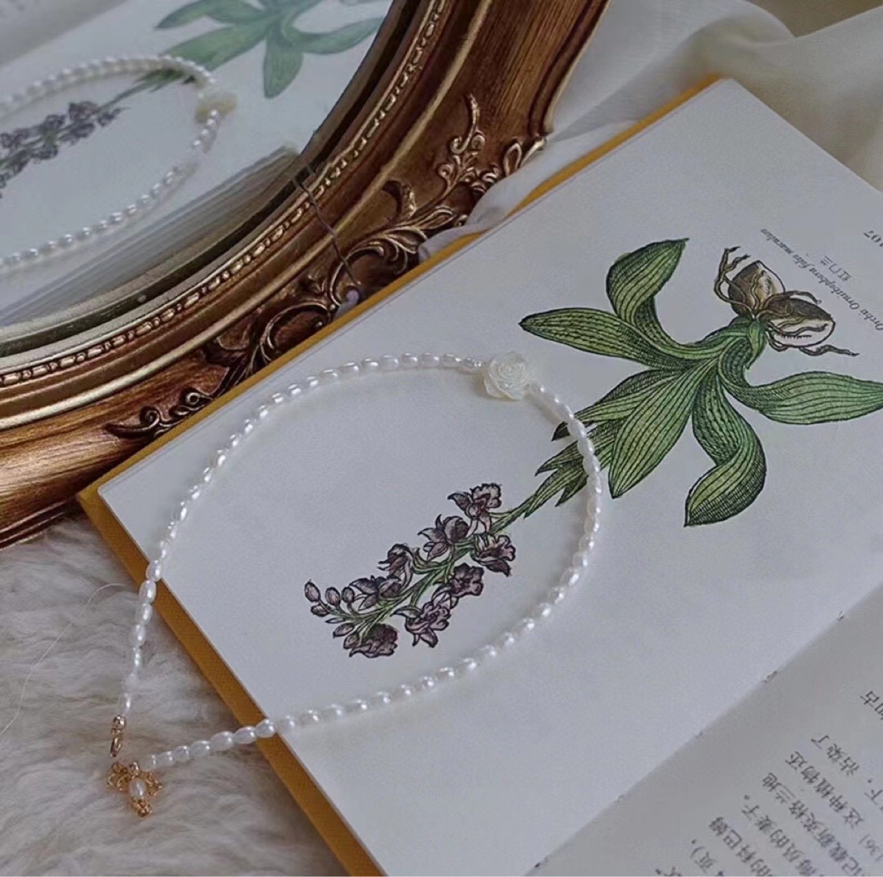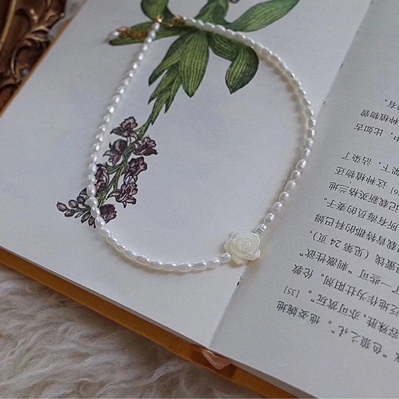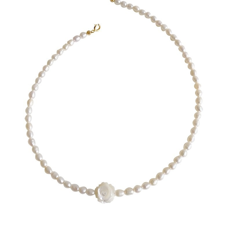 White Rose Natural Freshwater Pearl Necklace Women's All-match14k Gold-filled French Light Luxury Rice-shaped Pearl Clavicle Chain Summer