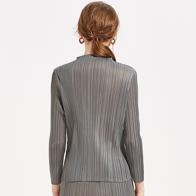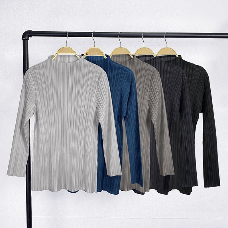 Miyake Simple Classic Style Pleated Women's Long-sleeved Tops Women's Spring Stand-up Collar Long-sleeved Tops T-shirts One Piece For Dery