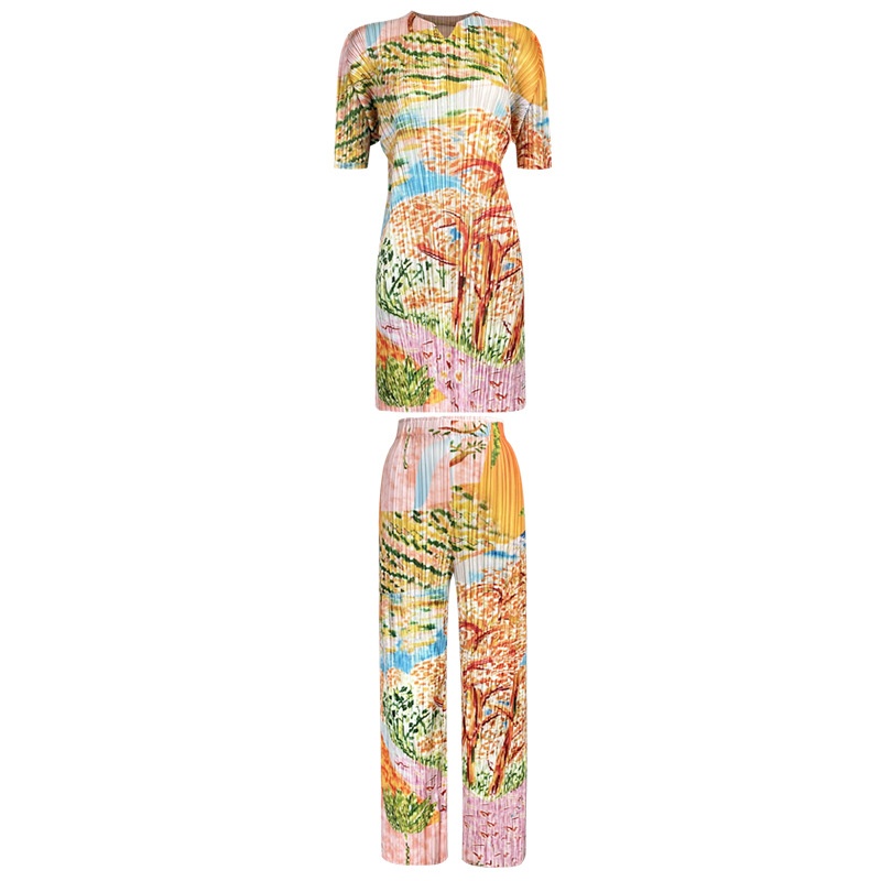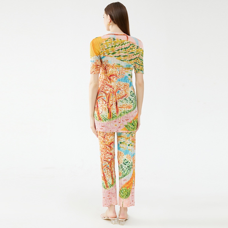 Spring Niche Temperament Tree Painting Print Small V-neck Short-sleeved Top Female Casual Trousers Pleated Suit Female