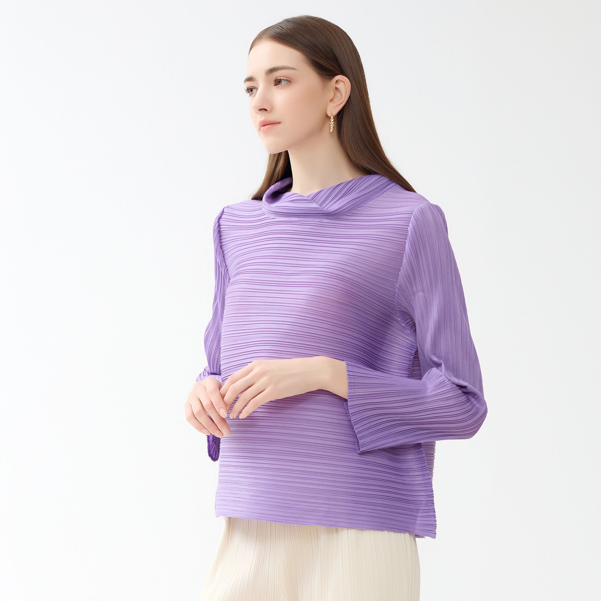 Spring Pleated Casual Style Long Sleeve A-line Scarf Collar Slim Fashion Solid Color Large Size Women's T-shirt