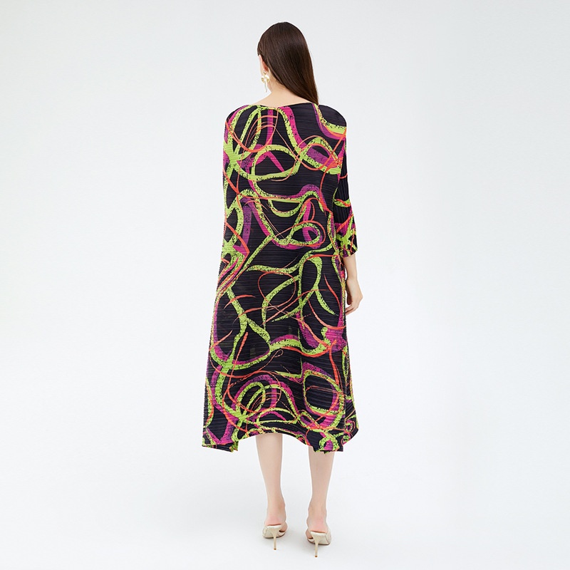 Miyake Spring Women's Design Loose Line Printing Slit Casual Pleated Midi Skirt Women's Dress
