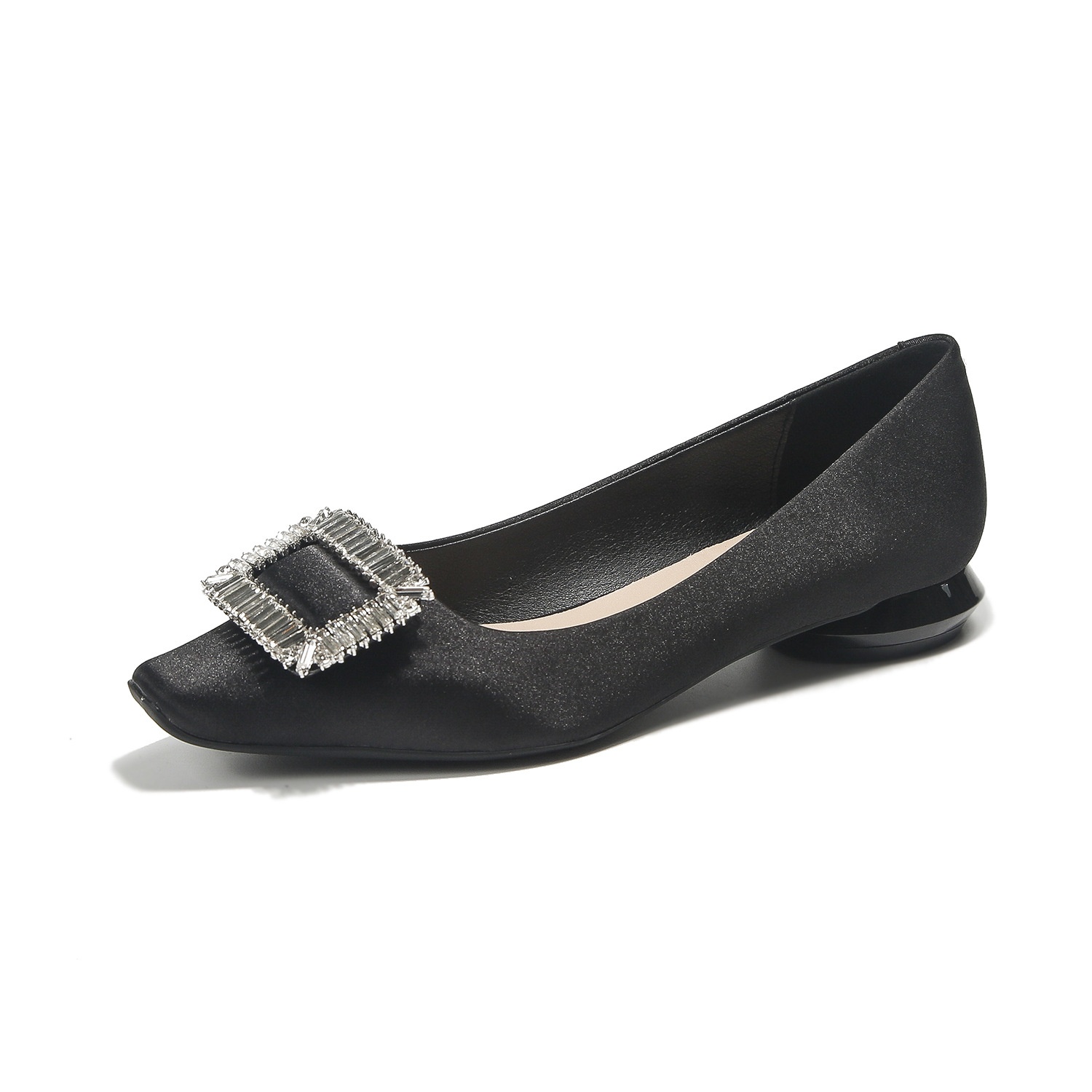 7318-1 French Classic Rhinestone Square Buckle Thick Heel Single Shoes Women's Satin Silk Low Heel Flat Shoes Temperament Sheepskin