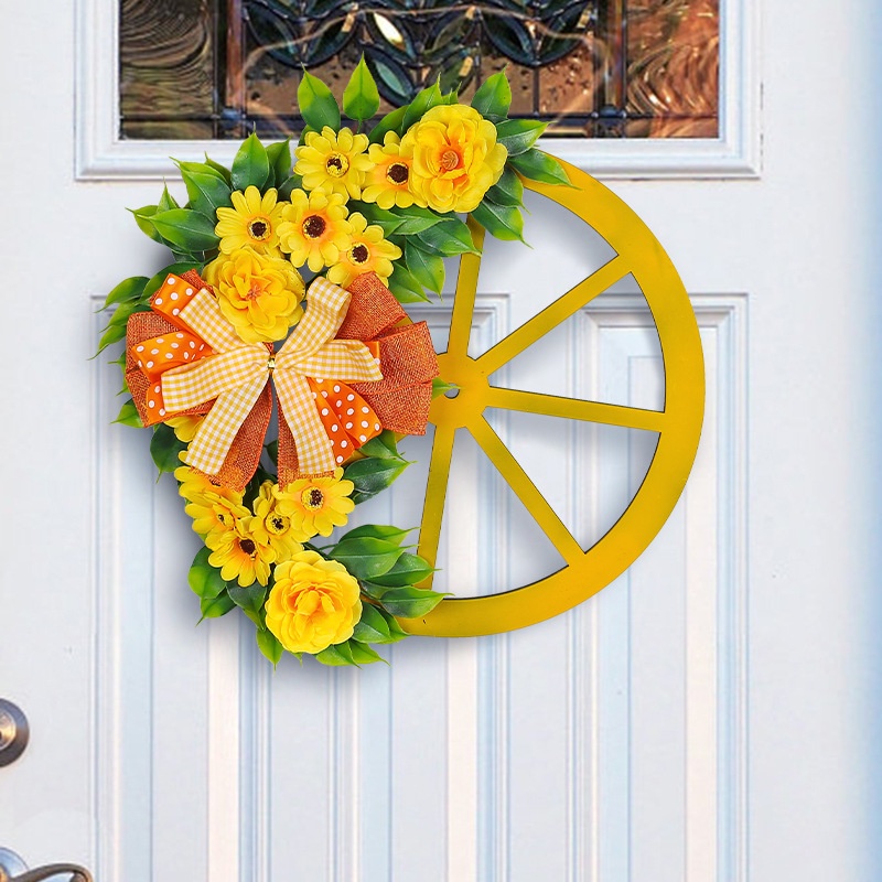 Spring Yellow Flower Wheel Wreath Simulation Bow Wreath Creative Wooden Wheel Decorative Flower
