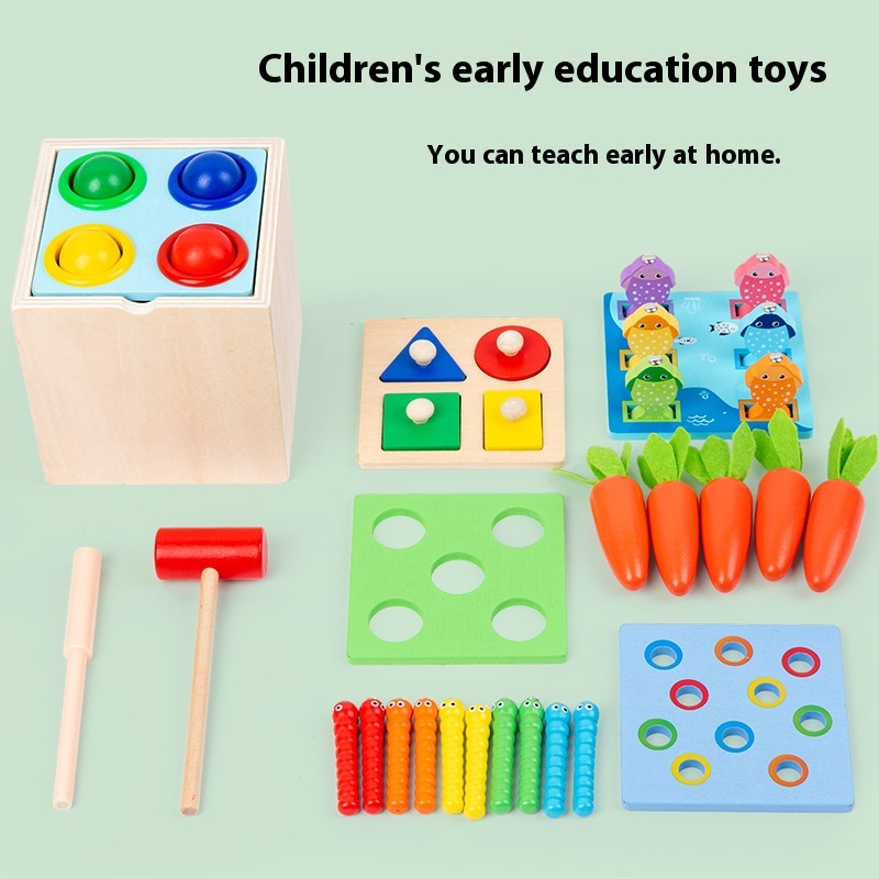 Wooden Montessori Children's Five-in-one Knock Ball And Pull Carrot Intelligence Box Teaching Aids Early Education Color Matching Cognitive Toys