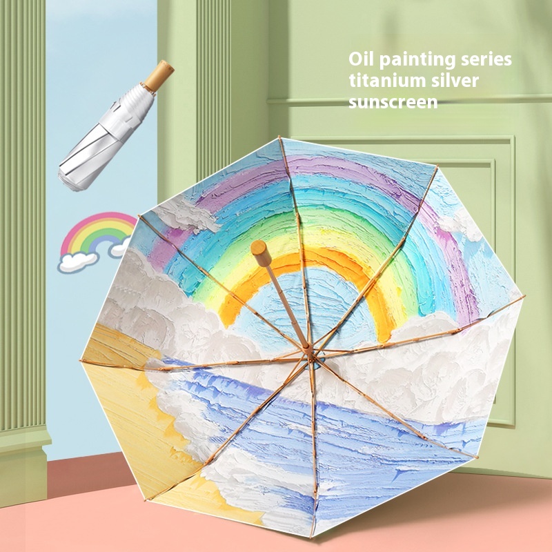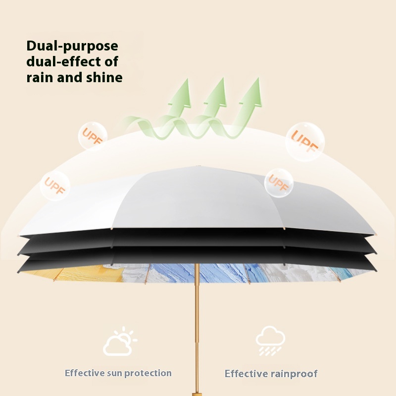8 Bone Hand-opened Ink Painting Three-fold Titanium Silver Glue Sun Protection Sun Umbrella Female Personality Customizable Solid Wood Sunny Umbrella