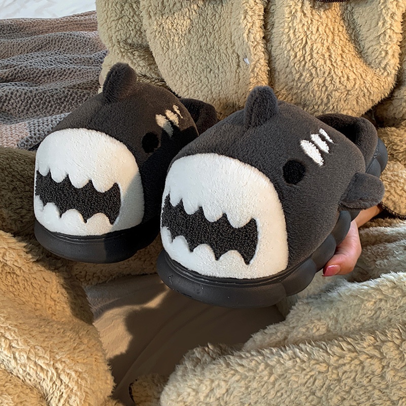 Cute Cartoon Shark Warm Plus Velvet Cotton Slippers For Women Autumn And Winter Thick Bottom Stepping Shit Feeling Couple Home Cotton Shoes
