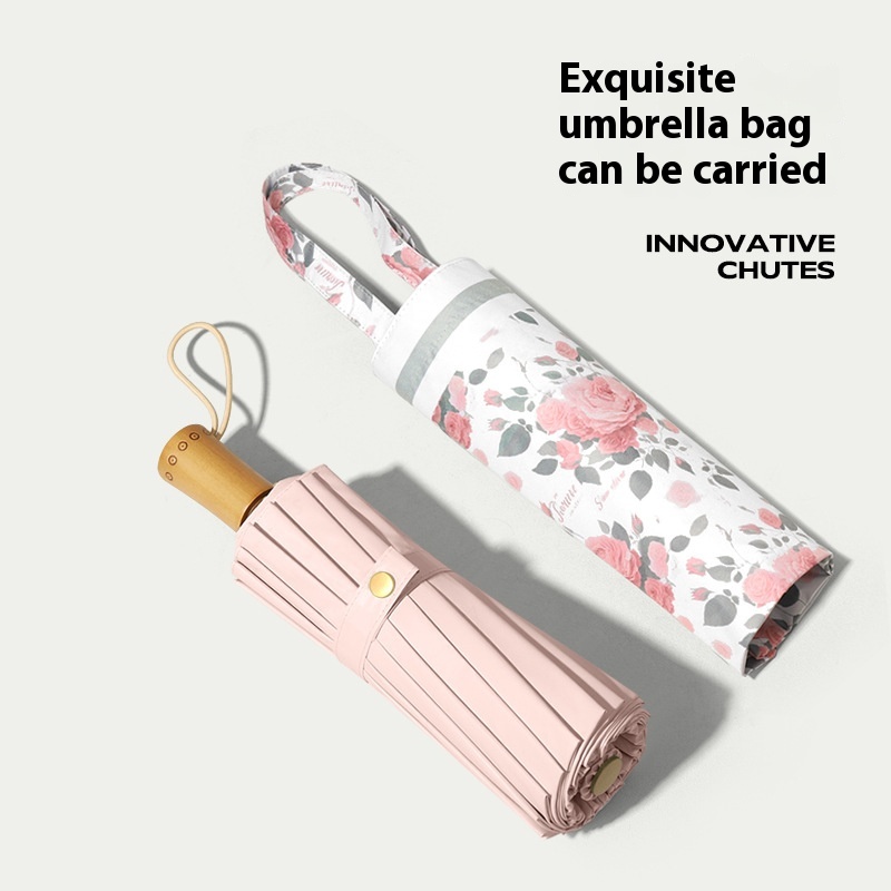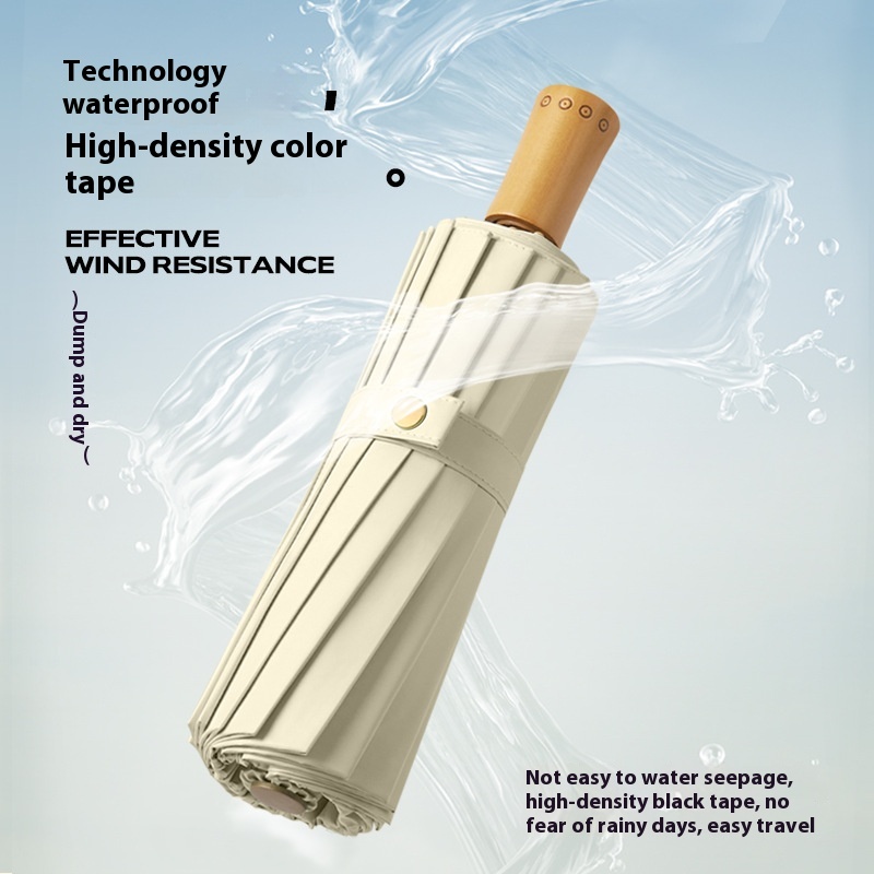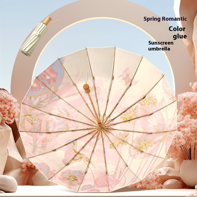 Three-fold16-rib Folding Umbrella,Larger Sunny And Rainy Dual-use Umbrella,Small And Fresh Color,Wind-resistant Umbrella,Wooden Handle Umbrella