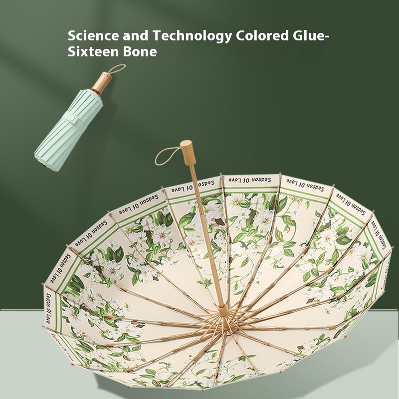 16 Bone Color Glue Three Fold Hand Open Wooden Handle Rainproof Sunscreen Anti-ultraviolet Dual-purpose Umbrella