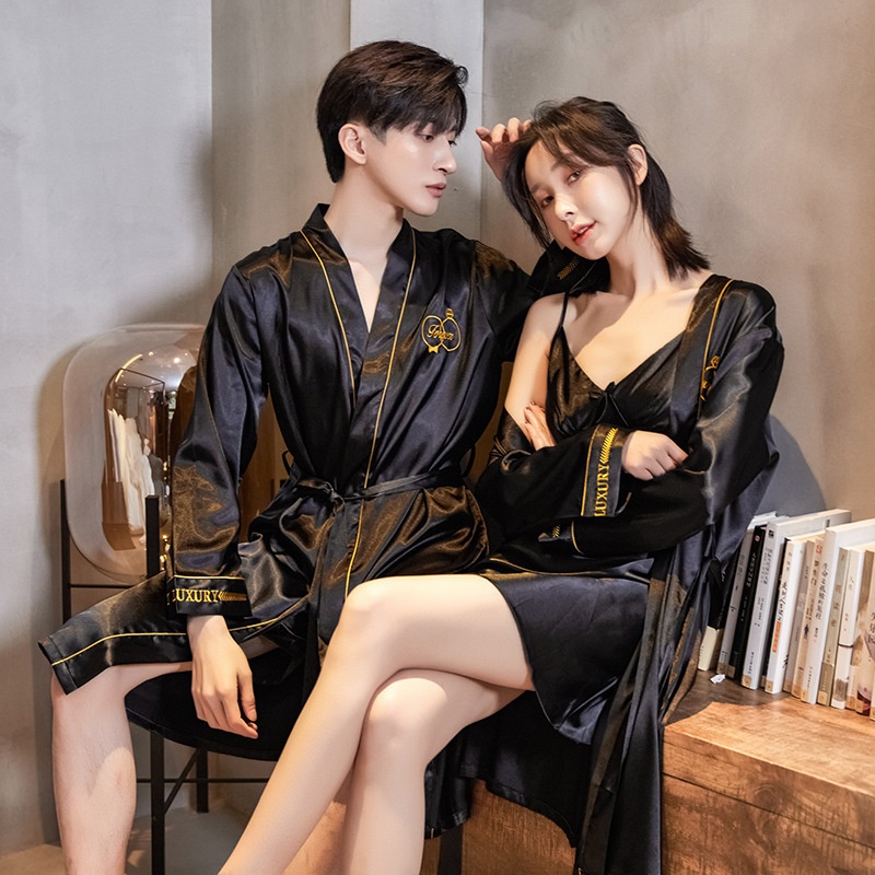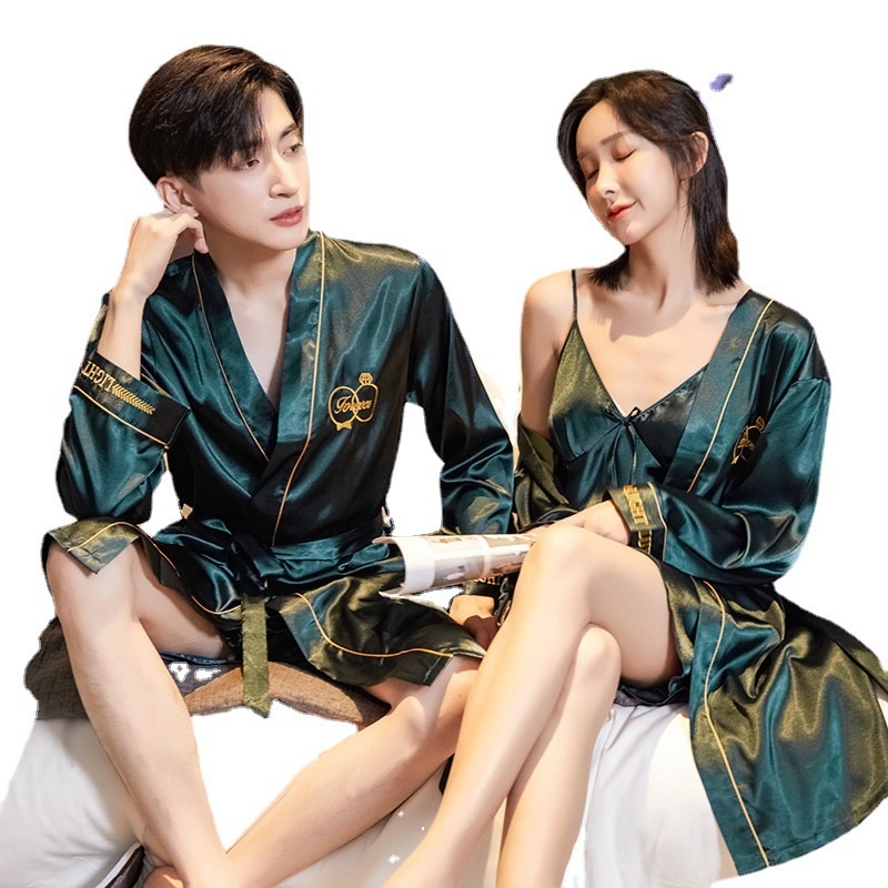Spring And Autumn Wedding Sexy Couple Nightgown Nightdress Ice Silklywed Red Wedding Men And Women Long-sleeved Bathrobe Silk