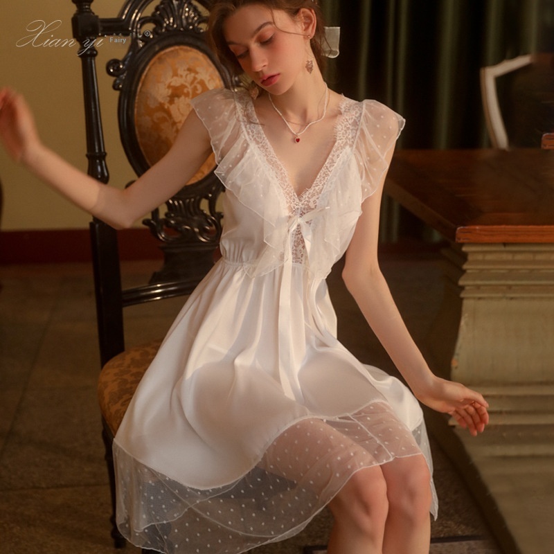 Xianyi Private Long Pajamas Imitation Silk Pure Desire Style Nightdress Lace Sling Ladies Home Clothes Can Be Worn Outside472