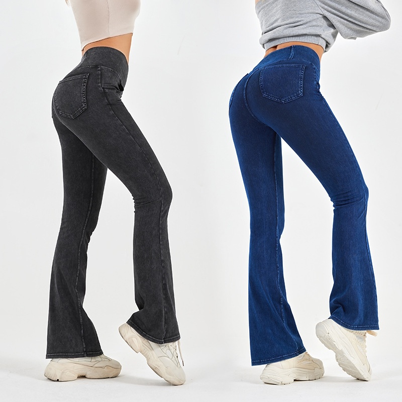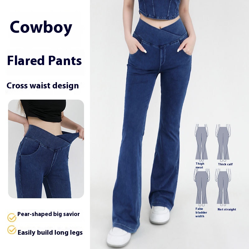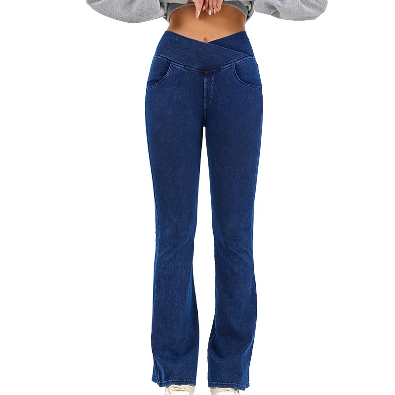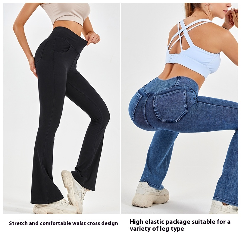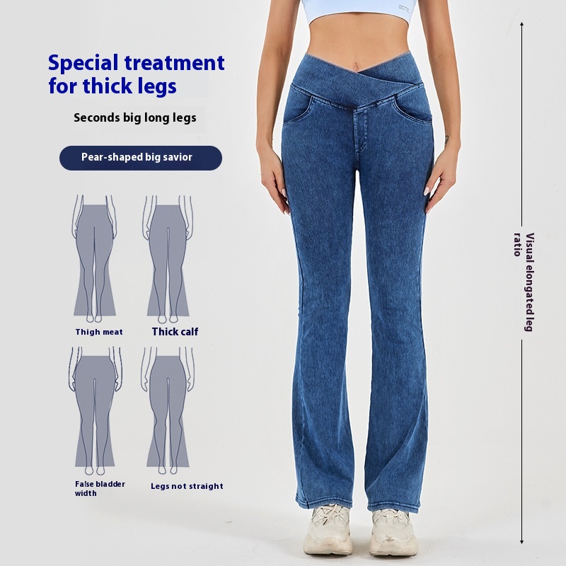 Spring And Summer Cross Waist Jeans For Women High Elastic Hip Lift Double Pocket Sports Wear Yoga Fitness Flared Pants