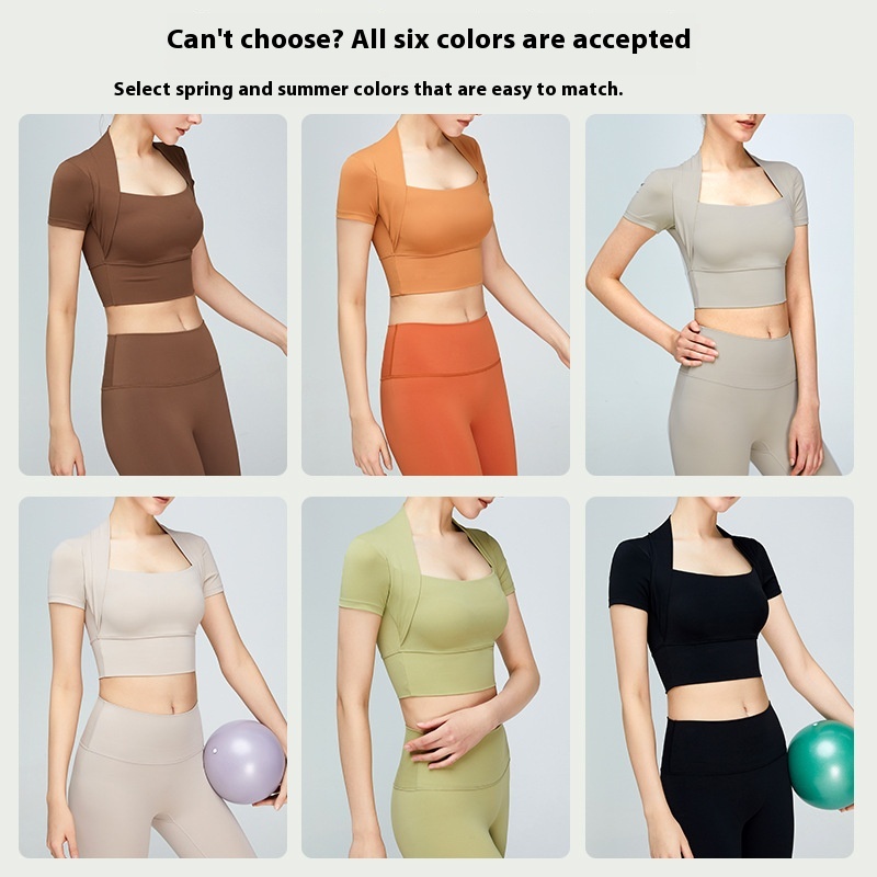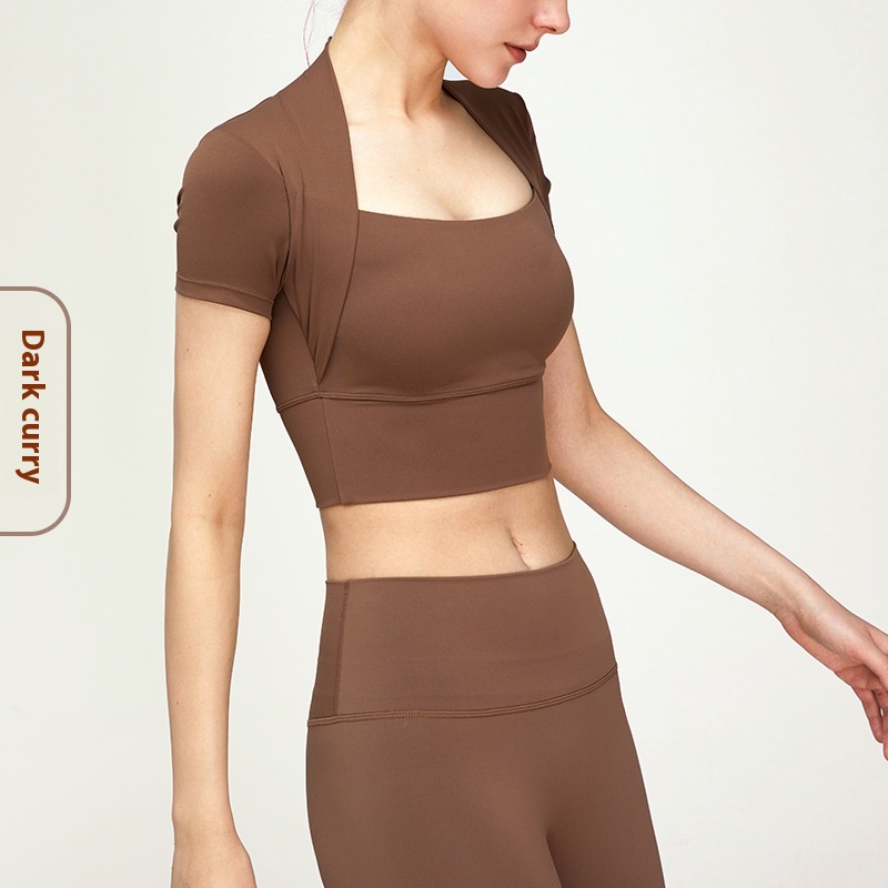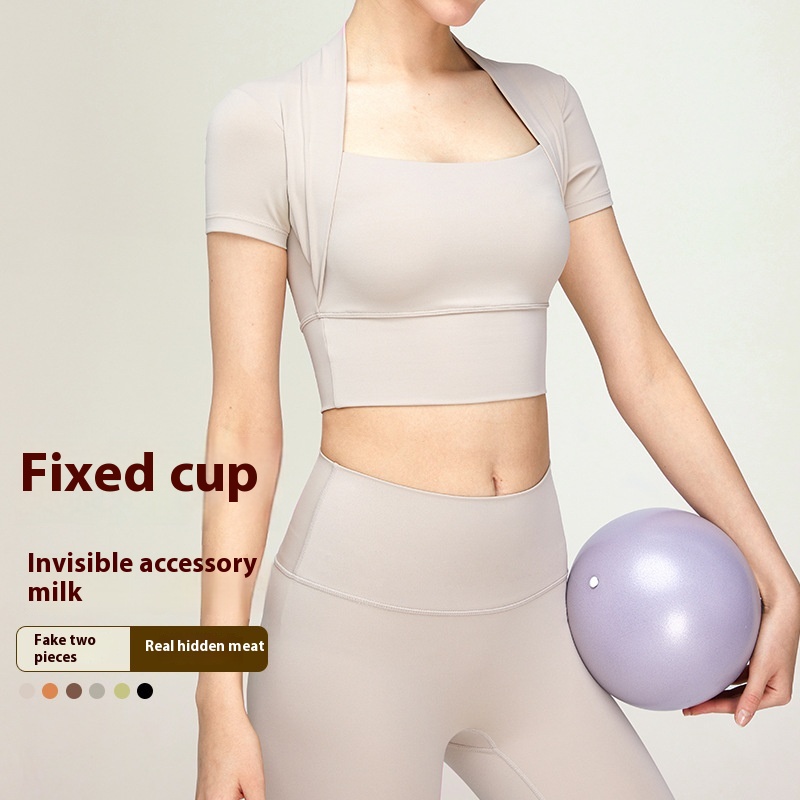 Nude Yoga Top Short Sleeve Women Fixed Cup Fitness Clothes Running Sports T-shirt Quick Dry Breathable Tight Yoga Clothes