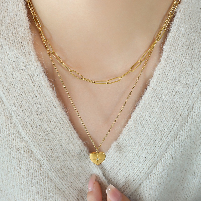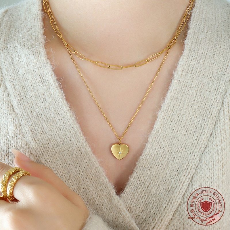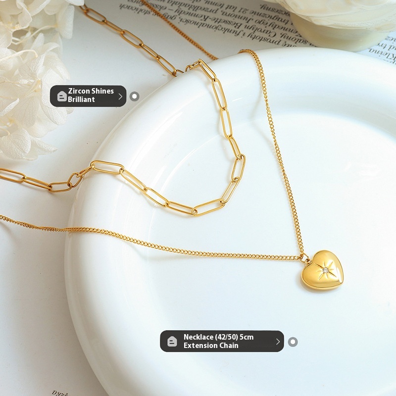 European And American Jewelry Double-layer Heart-shaped Star Inlaid Zircon Pendant Necklace Titanium Steel Plated18k Gold Light Luxury Style Jewelry