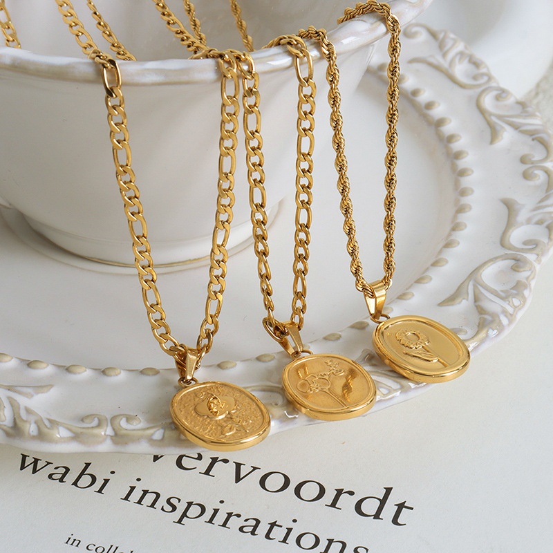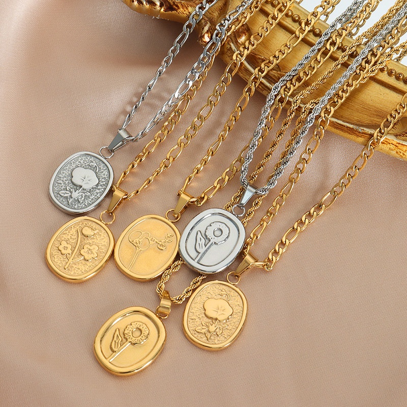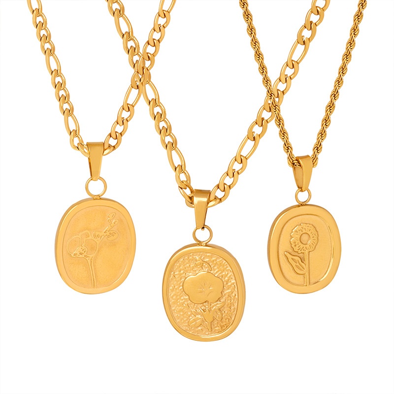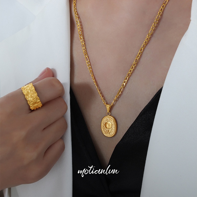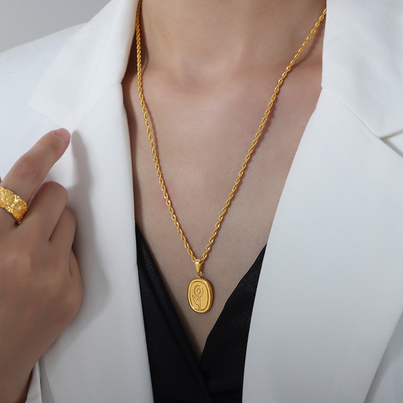 Hong Kong Style Niche Personality Temperament Elegant Oval Brand Embossed Flower Design Twist Chain Titanium Steel Gold-plated Necklace