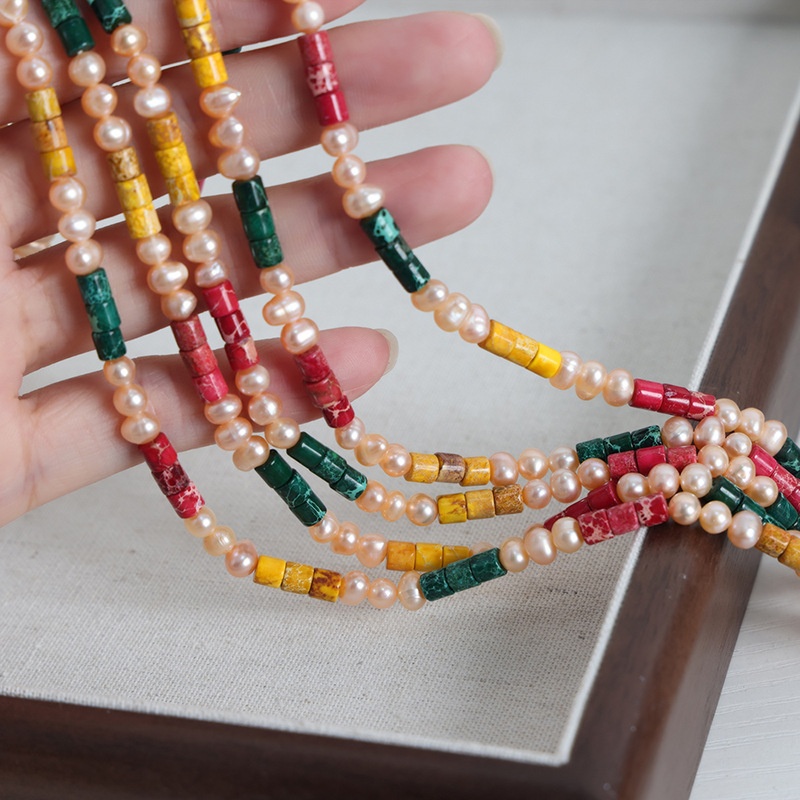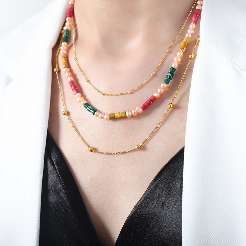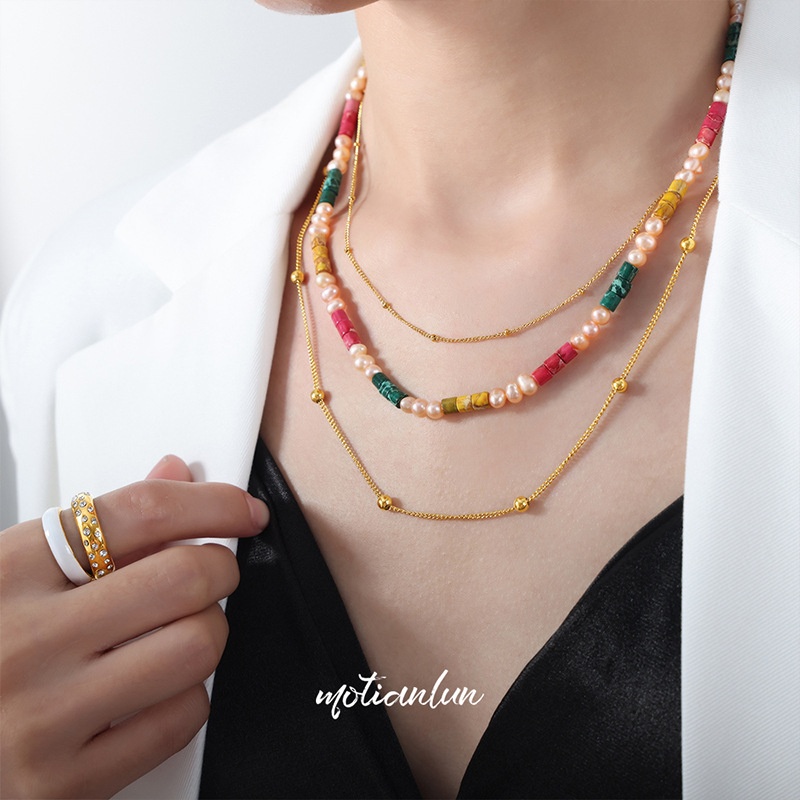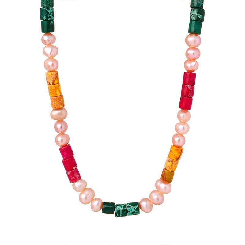 Dopamine Outfit Summer Leisure Vacation Style Colored Jade Freshwater Pearl Beads Handmade Titanium Steel Necklace