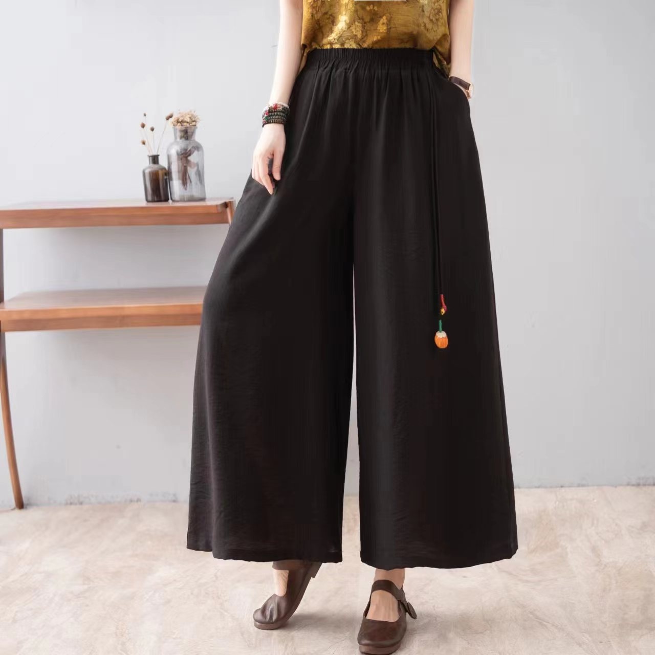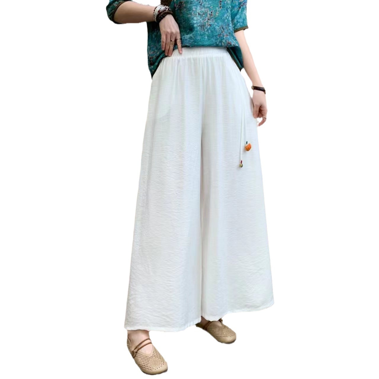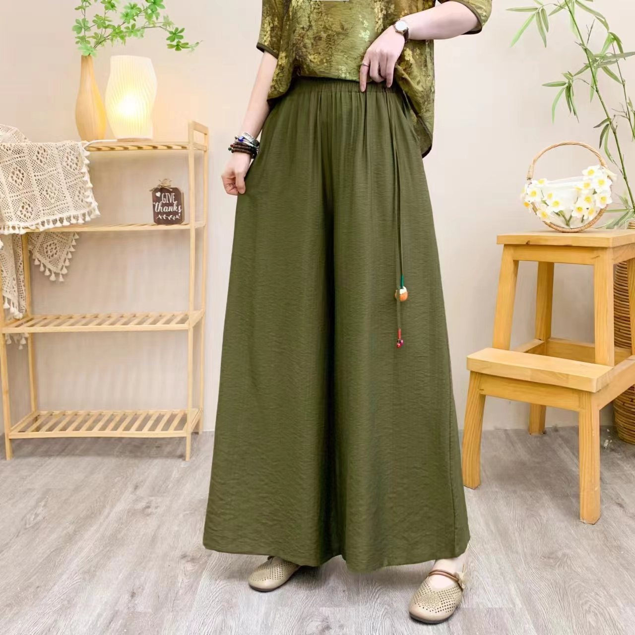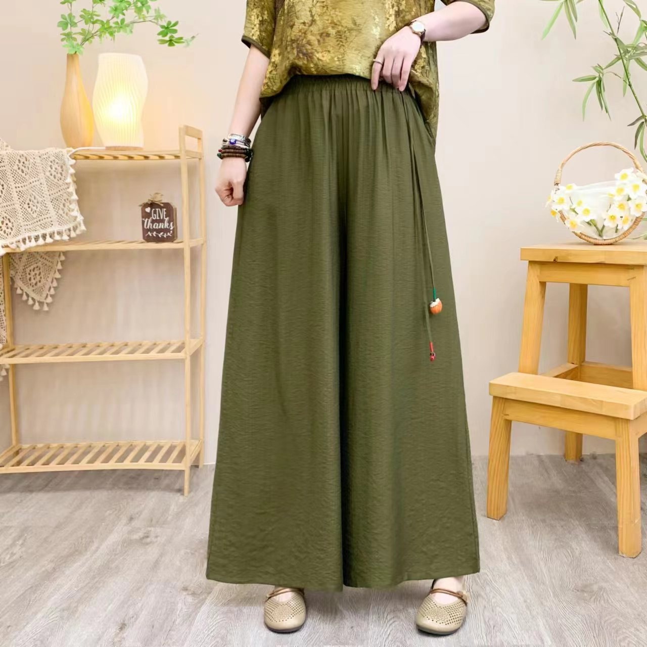 Summer Literary Retro Ethnic Style Mother's Dress Wide-leg Pants Solid Color Tencel Linen Casual Pants Wide-leg Pants For Women