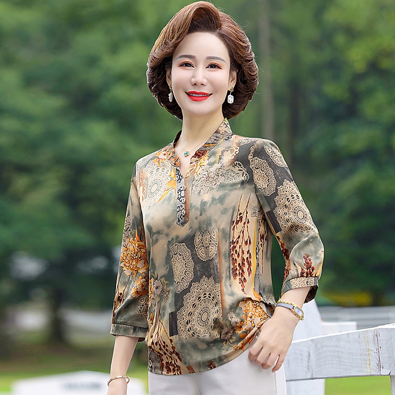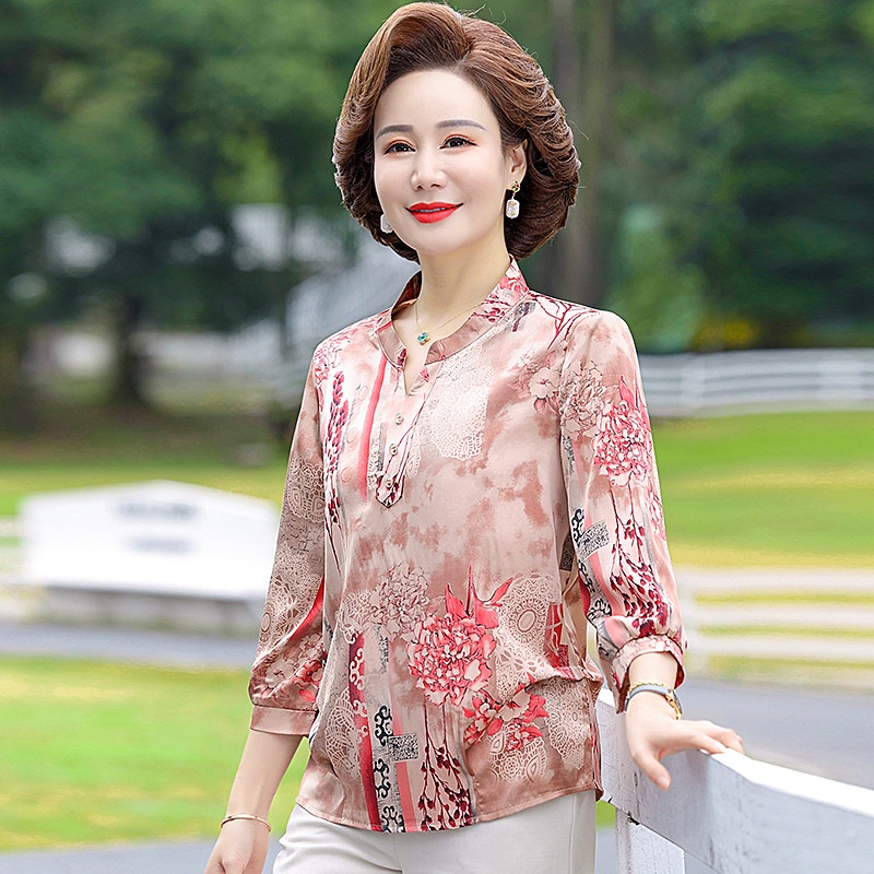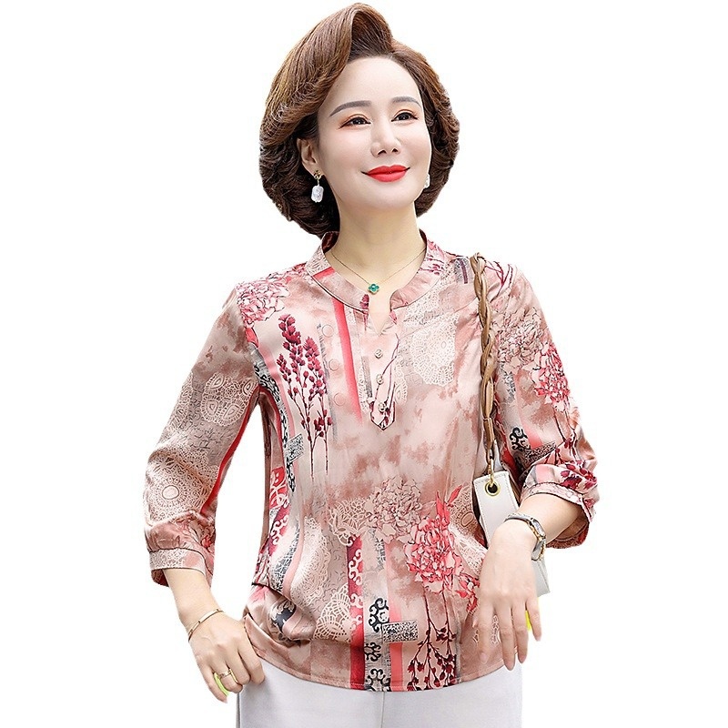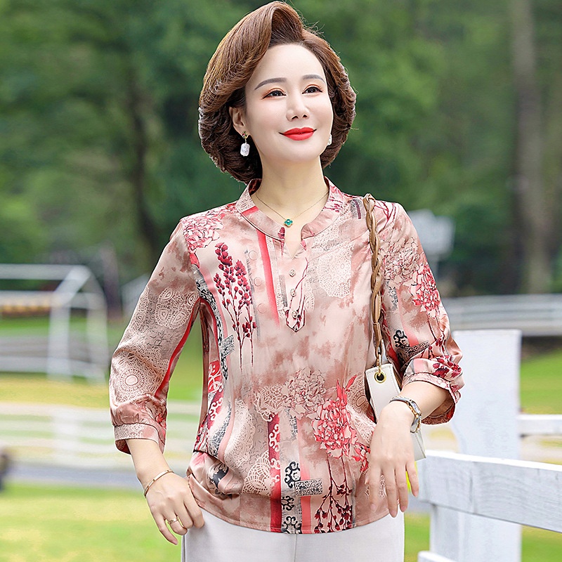 Mother Spring And Autumn Mid-sleeve Tops Middle-aged And Elderly Women's Spring And Summer Chiffon Shirts Ice Silk Western-style Shirts