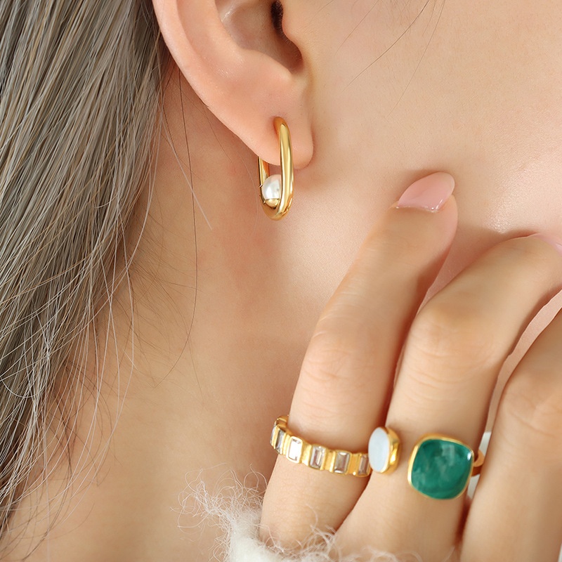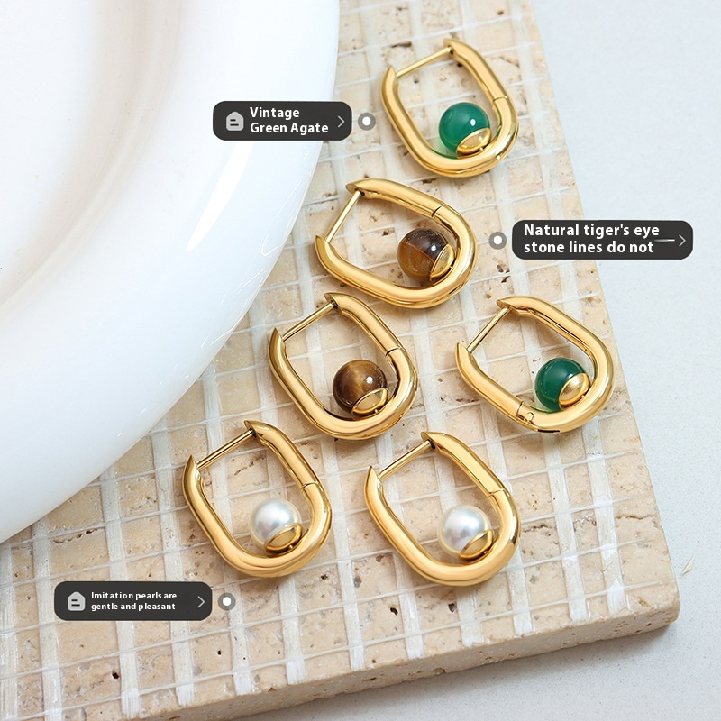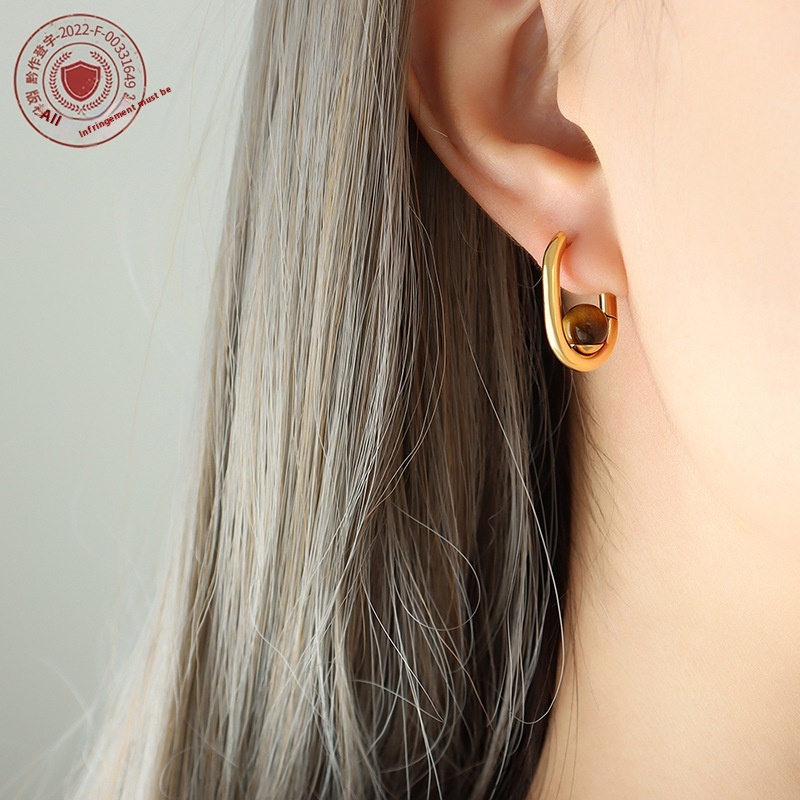 Retro Hong Kong Style Neutral Style Three-color Agate Tiger Eye Stone U-shaped Earrings Female Lucky Girlfriend Earrings Gold-plated Non-fading