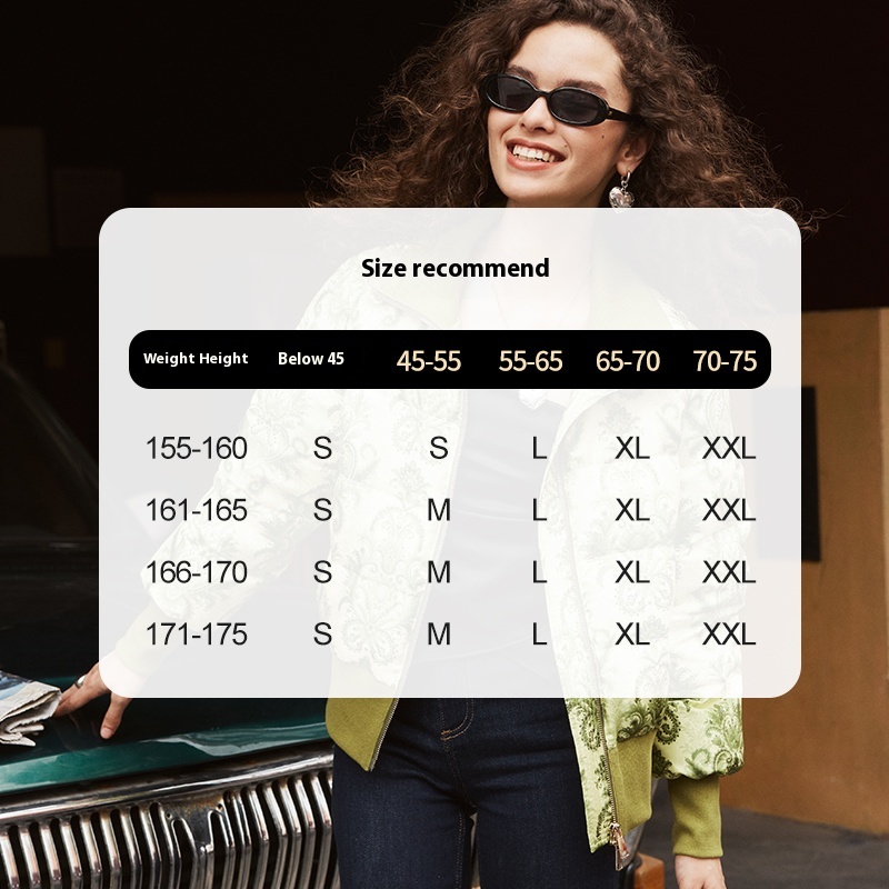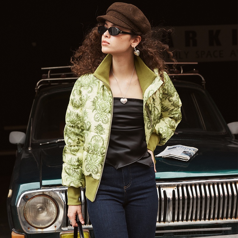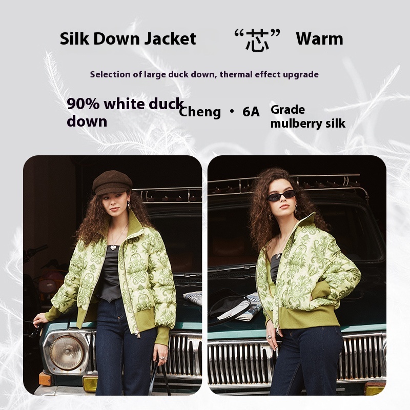 Retro Printed Waisted Silk Down Jacket For Women Winter Long-sleeved Thickened Coat Short Warm Jacket