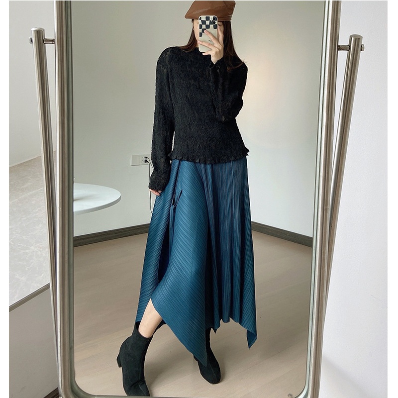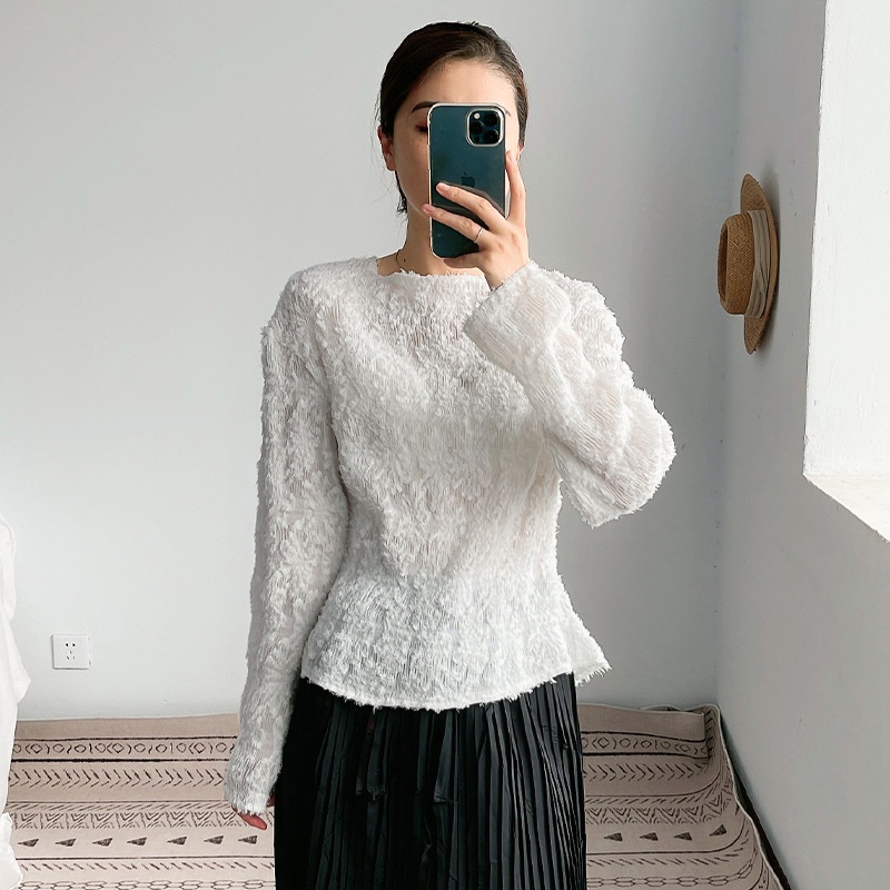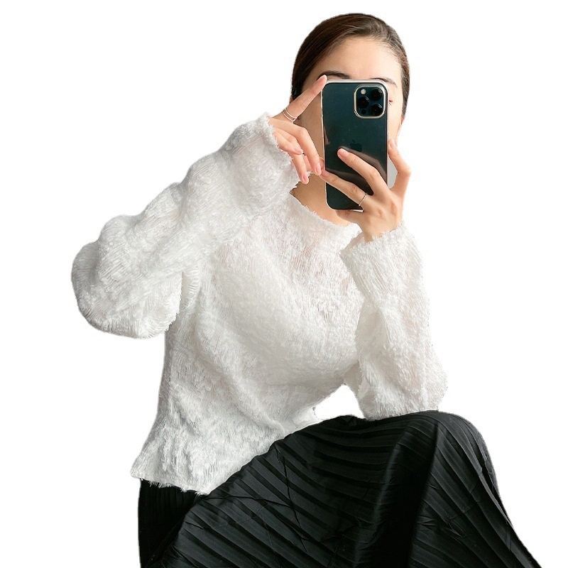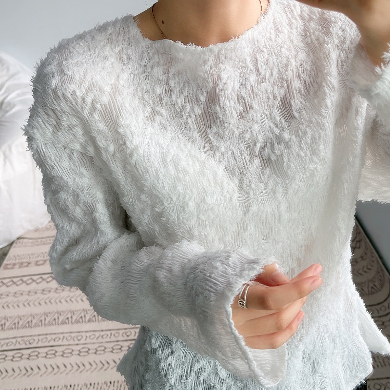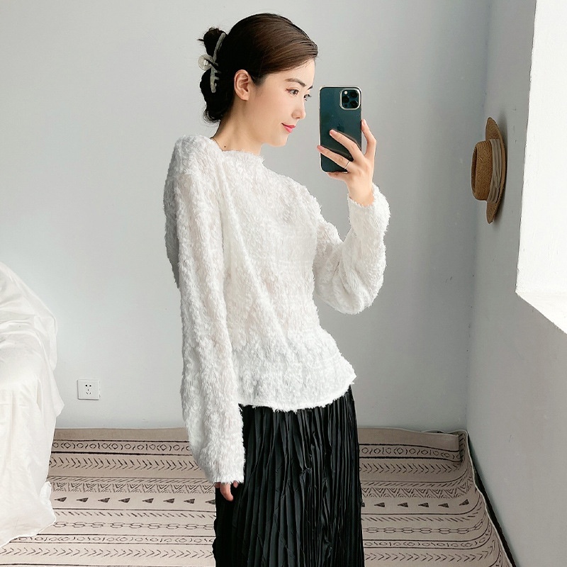 White Pleated Tops Women's Long-sleeved T-shirt Clothes Spring And Autumn Knitted Bottoming Blouse Versatile Loose Woolen Sweater