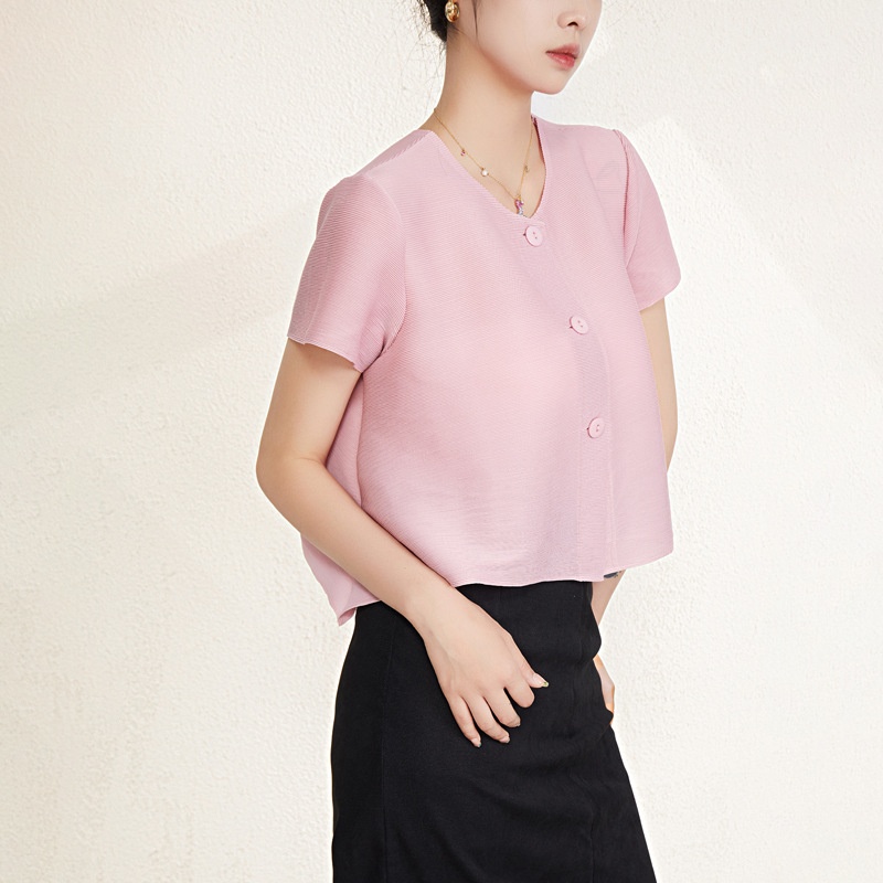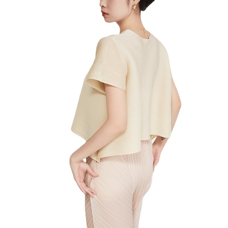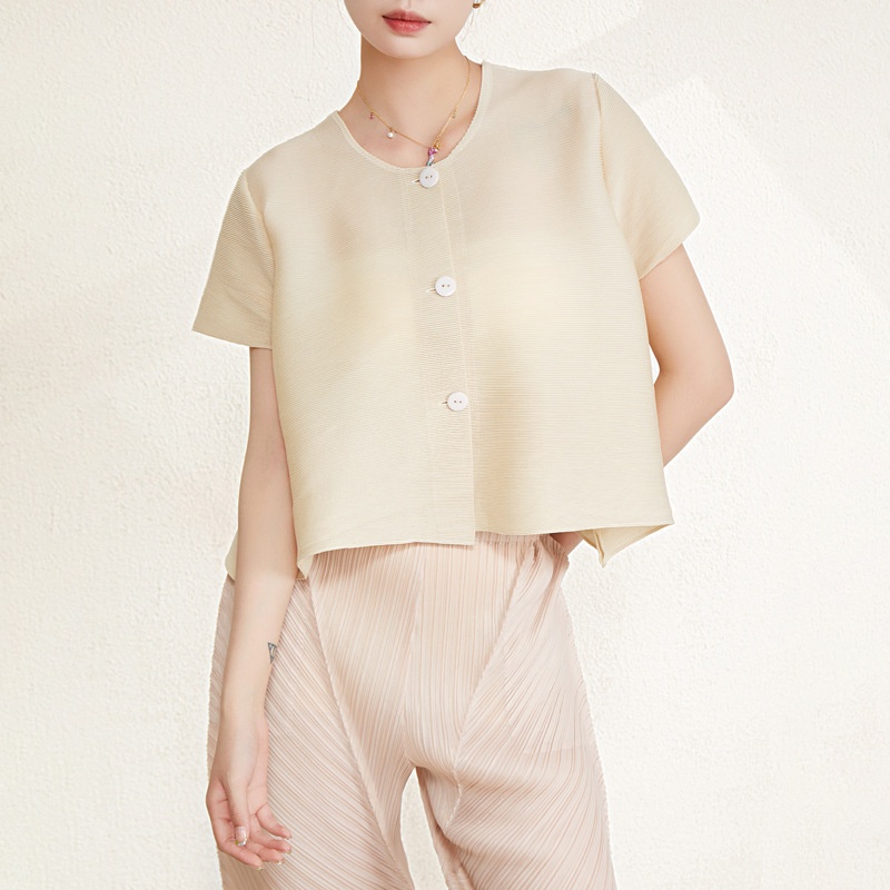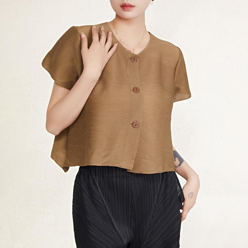 Button Design Niche Chiffon Shirt Summer Round Neck Short-sleeved Top Pleated Design Stylish