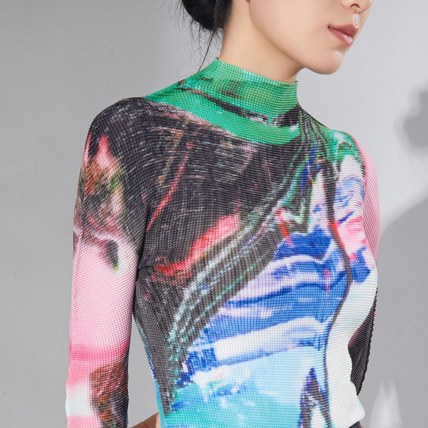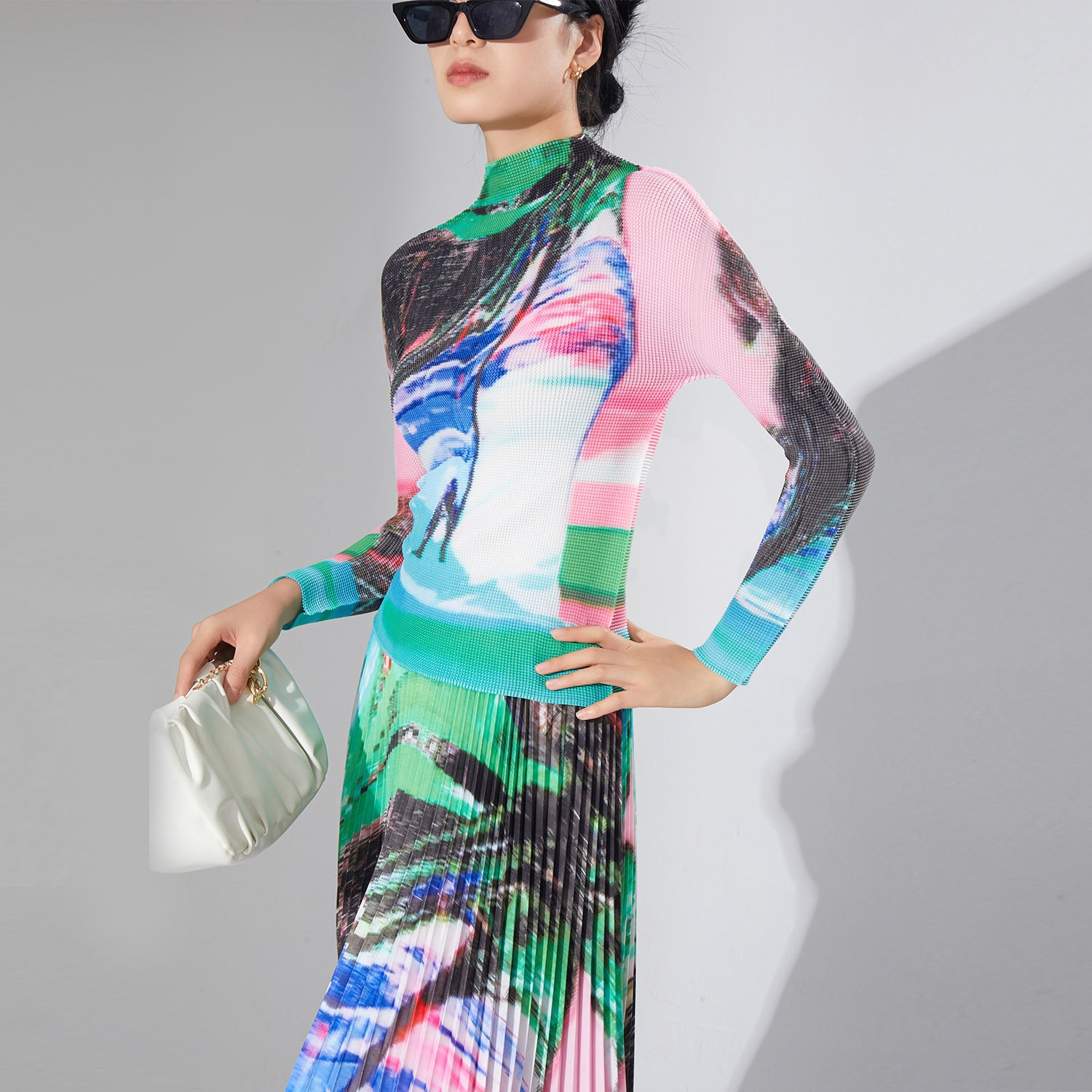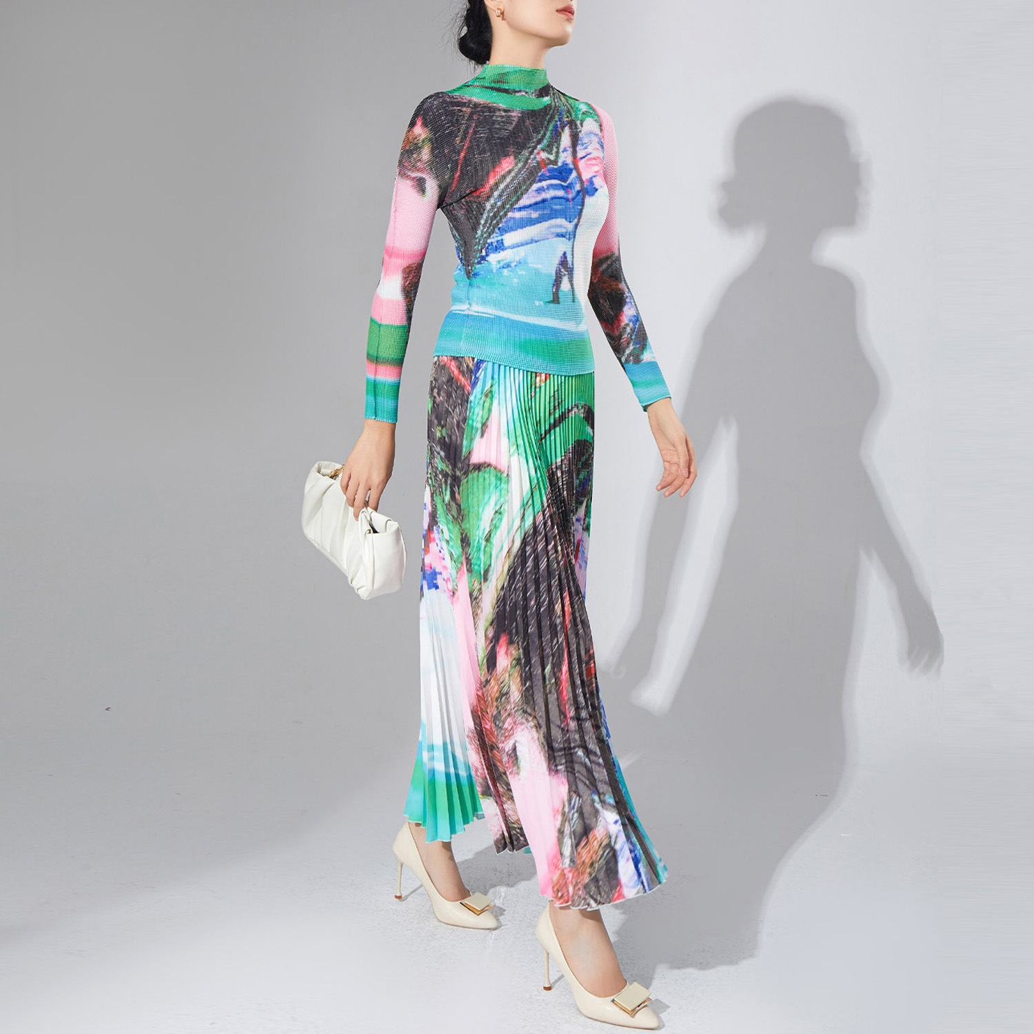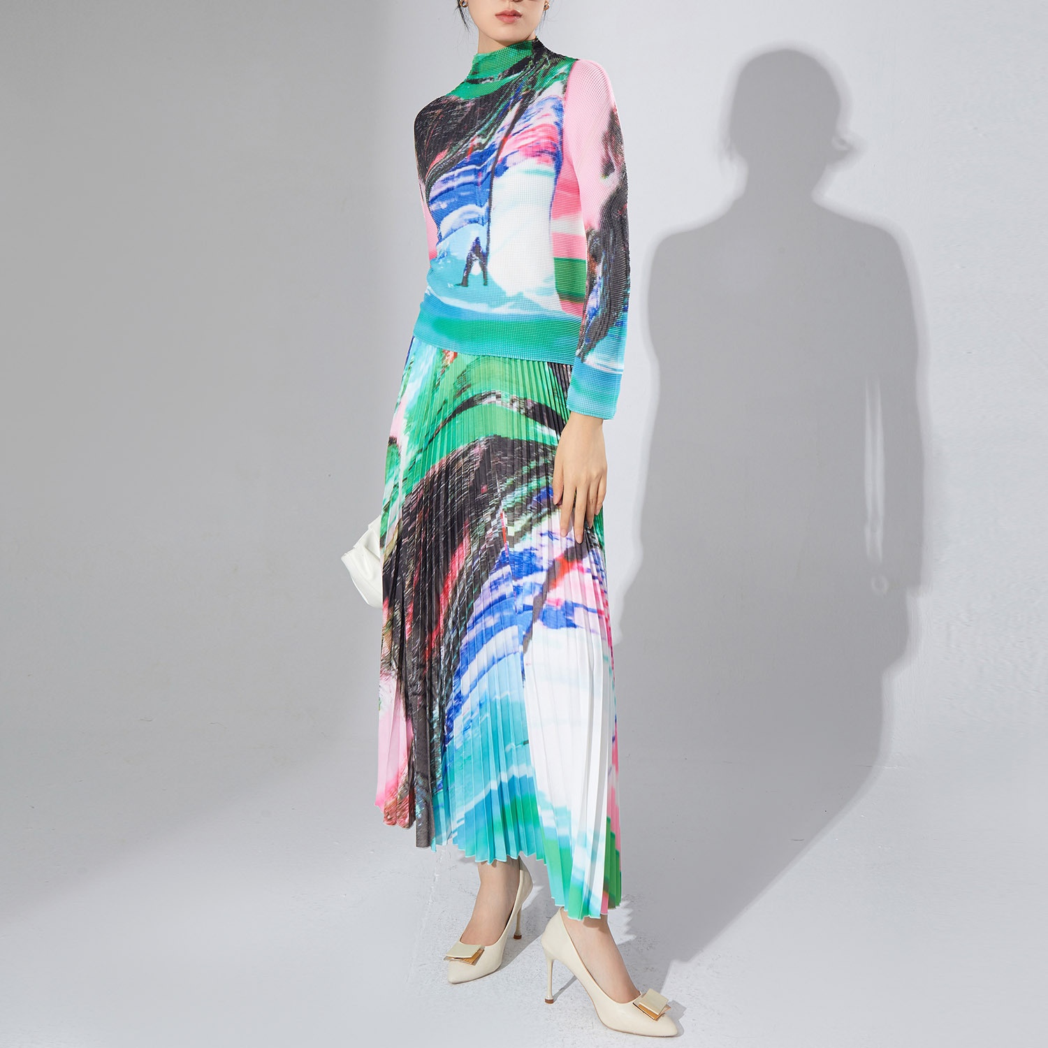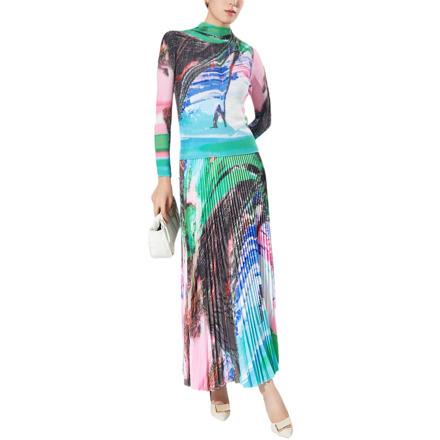 Spring Women's Temperament High-end Suit Turtleneck Printed Long-sleeved Top Pleated Skirt Two-piece Suit