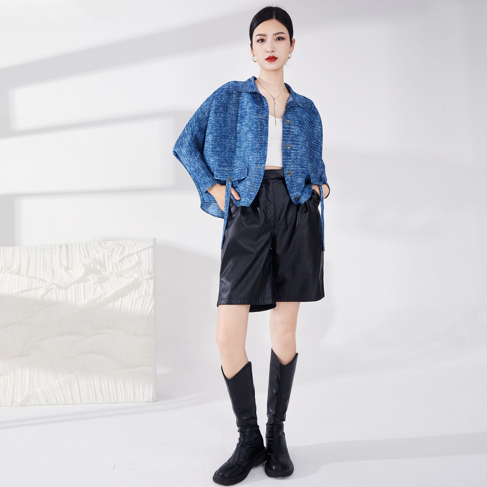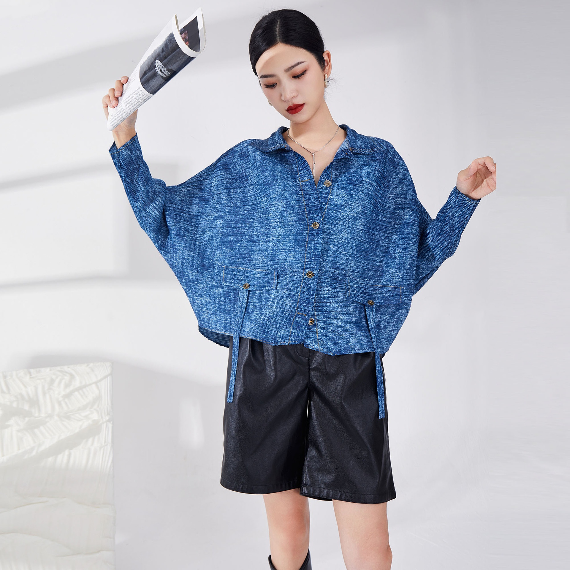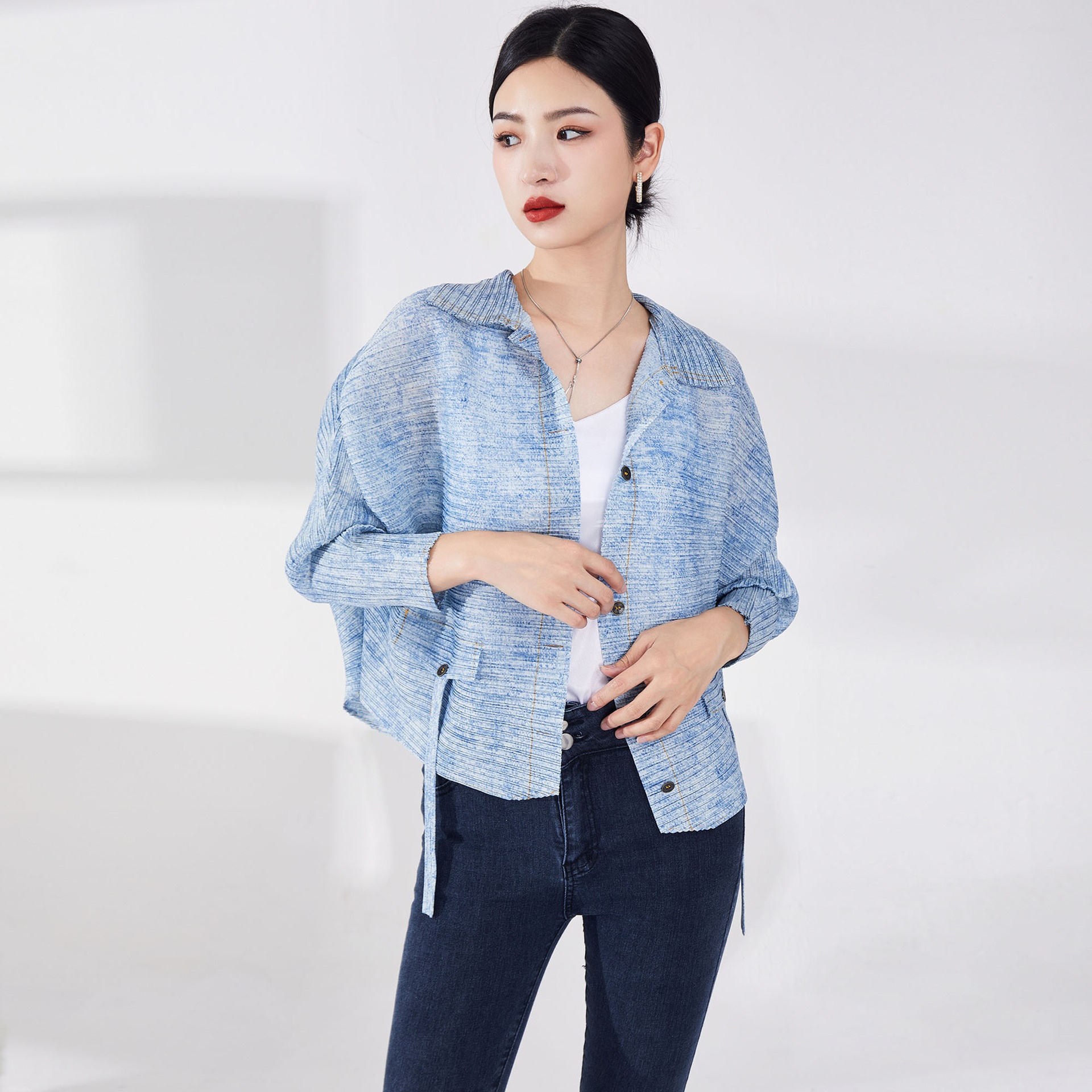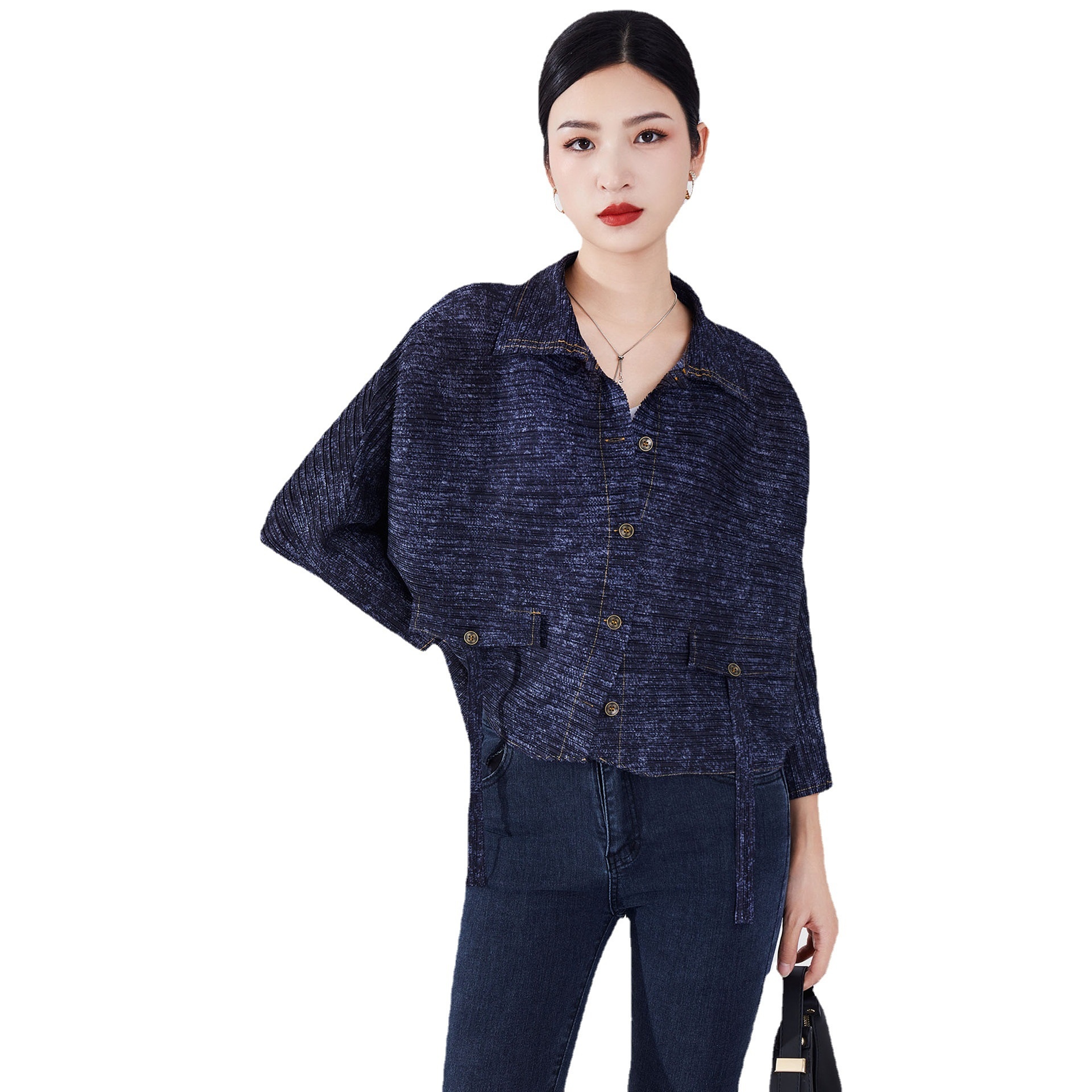 Pleated Denim Jacket For Women,Style For Spring And Autumn,Loose And Slim Bat Sleeve Top,Lazy Style,Fashionable And Versatile Cardigan
