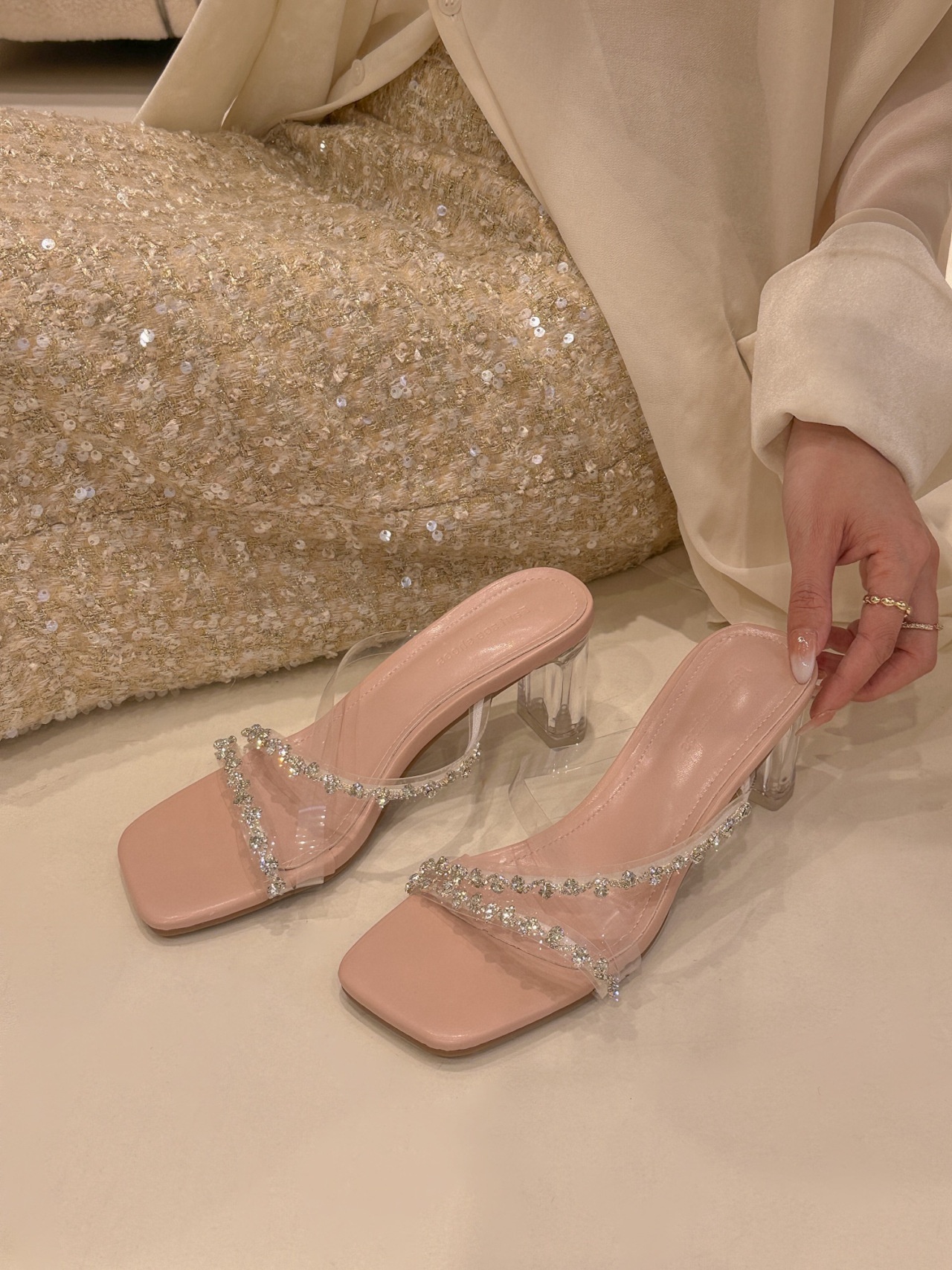 Summer Transparent Rhinestone Square Head Sandals For Women Pure Crystal Thick Heels Fashionable High Heels Flash