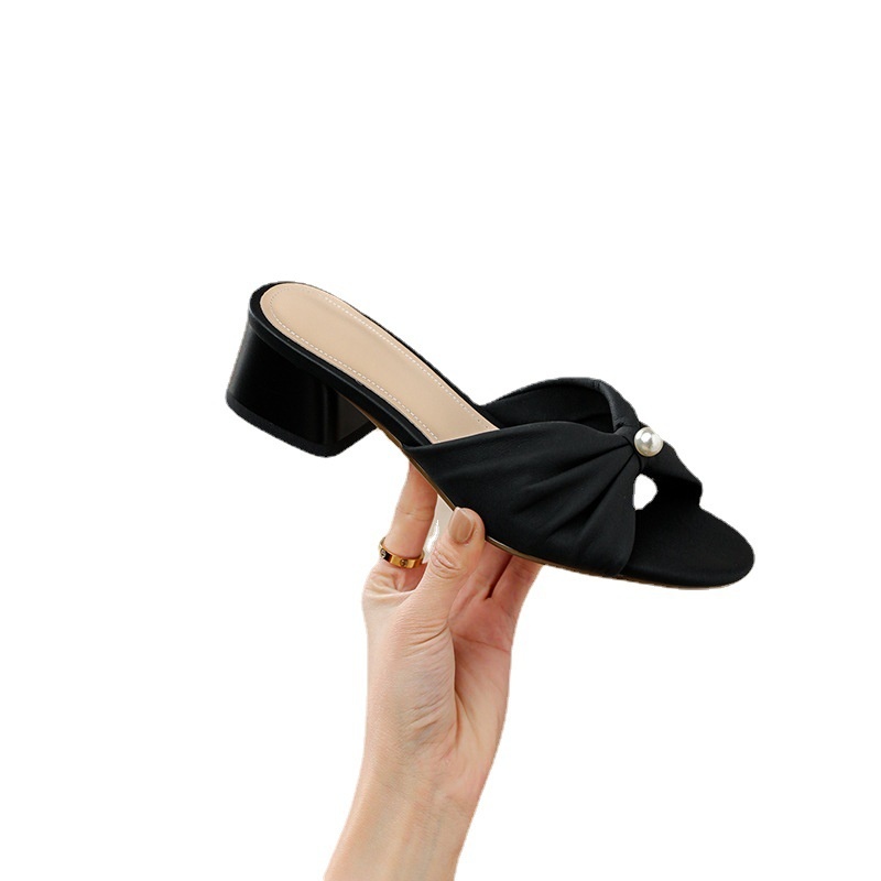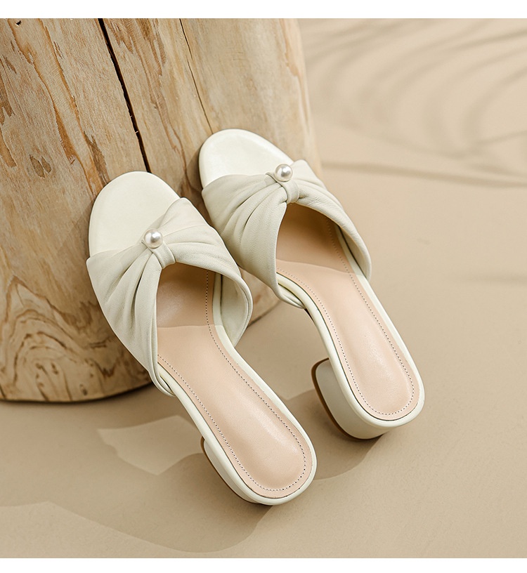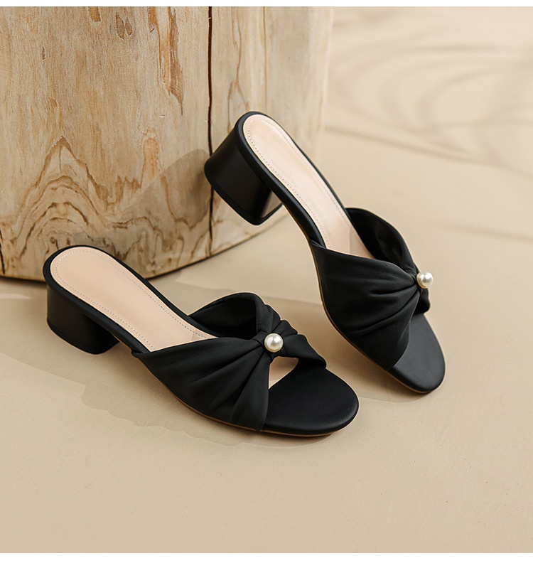 Summer French Leather Medium Thick Heel Open Toe Pearl Fish Mouth Comfortable Slippers Women's Outdoor Sandals