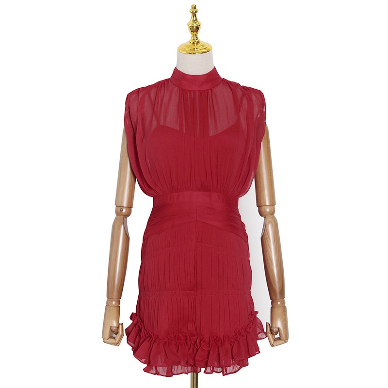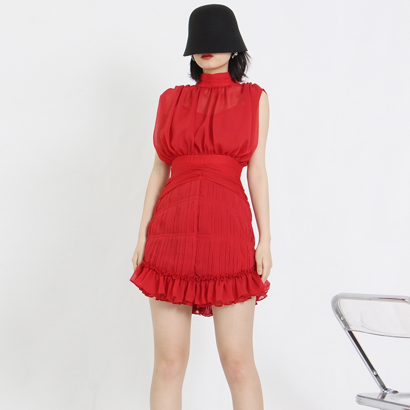 Temperament Elegant Ruffled Short Skirt Spring Style Fashion Stand Collar Sleeveless Waist Slim Dress Female