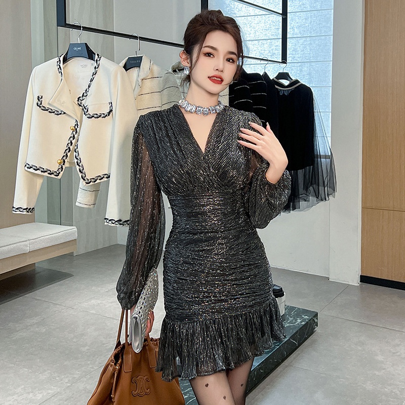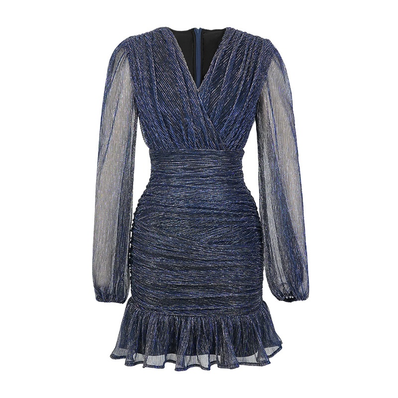 Spring Women's French V-neck Design Pleated Waist Long Sleeve Mesh Fishtail Dress40281