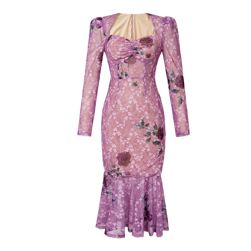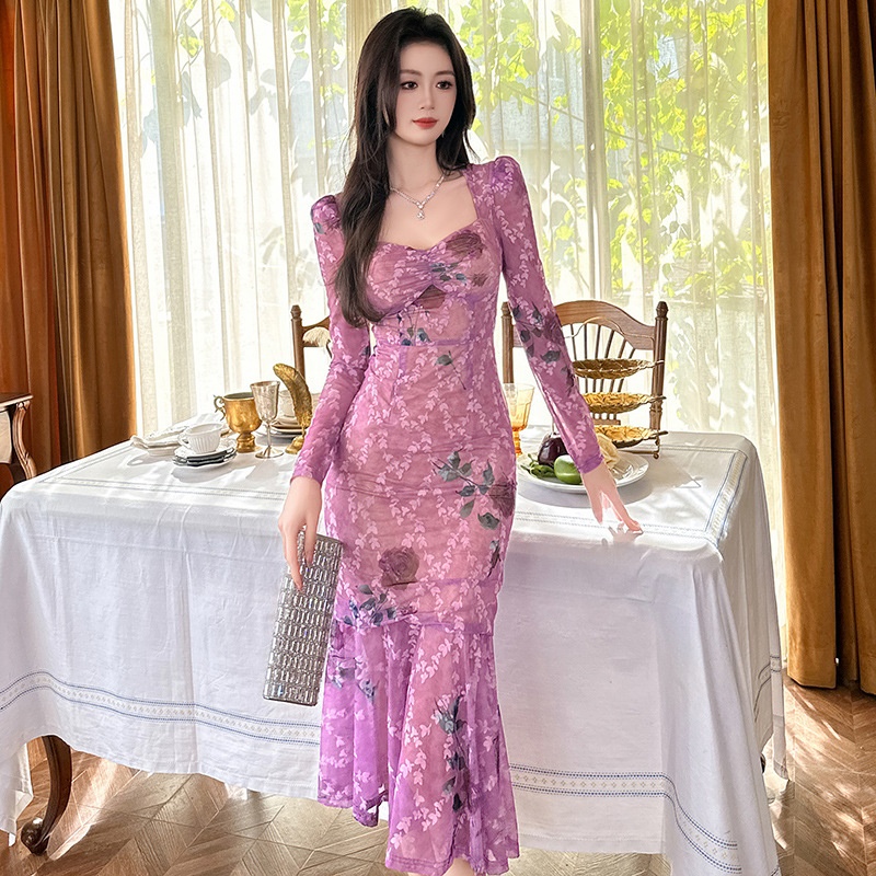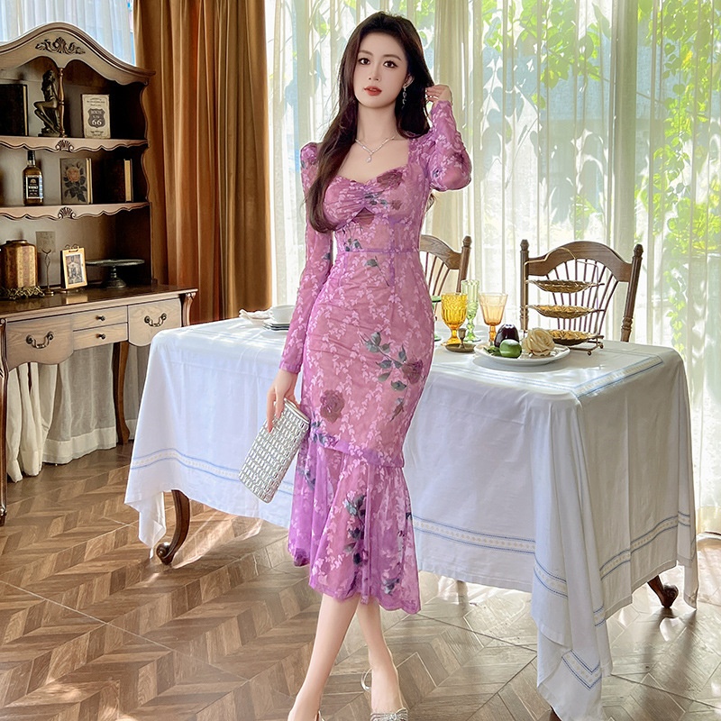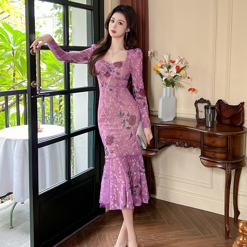 Spring Women's Sexy Hot Girl Floral Dress French Square Neck Slim Fishtail Long Skirt20808