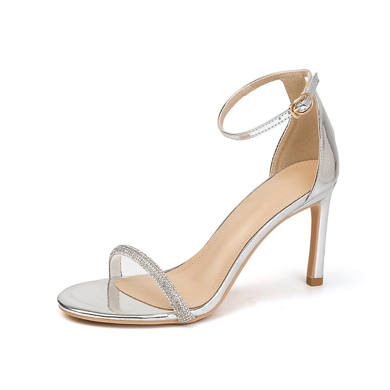 Silver High Heels With One Strap Spring And Summer Style Fairy Style Temperament Versatile Patent Leather Rhinestone Stiletto Sandals For Women